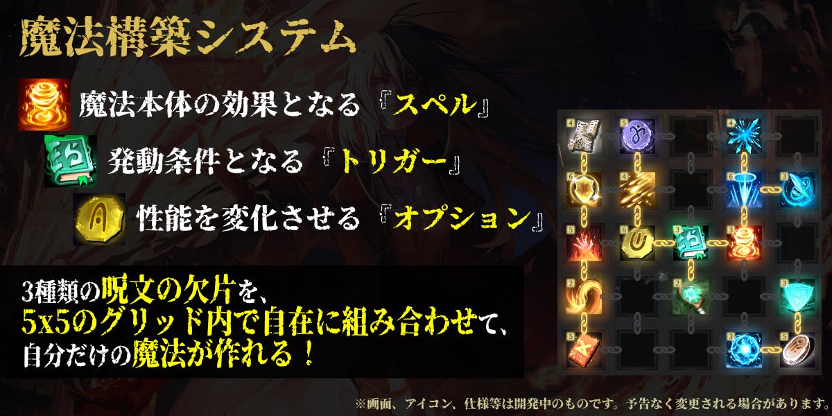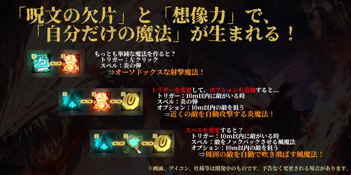 気に入った魔法を中心に事前にじっくり魔法を作ることと、ゲームのプレイごとに異なる要素を取り入れて魔法を上手く作り替えたりすることの、両方を楽しめるようにしていきます。