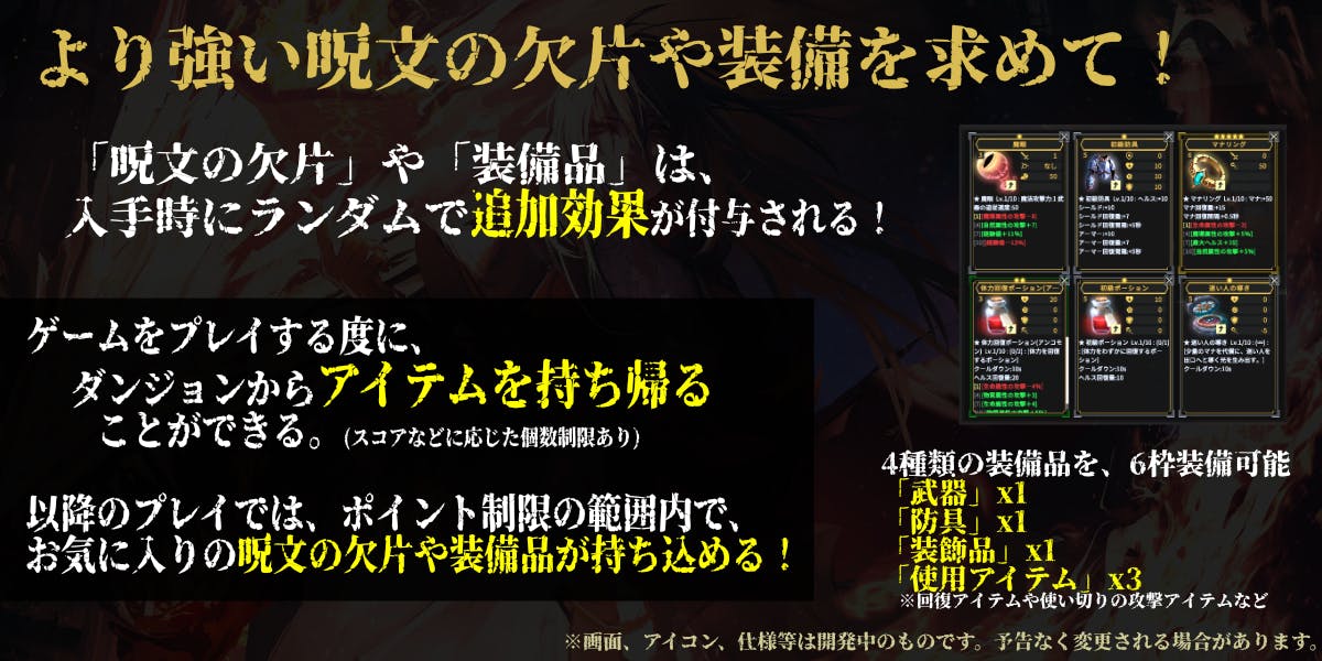 ゲームプレイ時には、事前に構築した魔法や、選んだ装備を持ち込むことができます。
