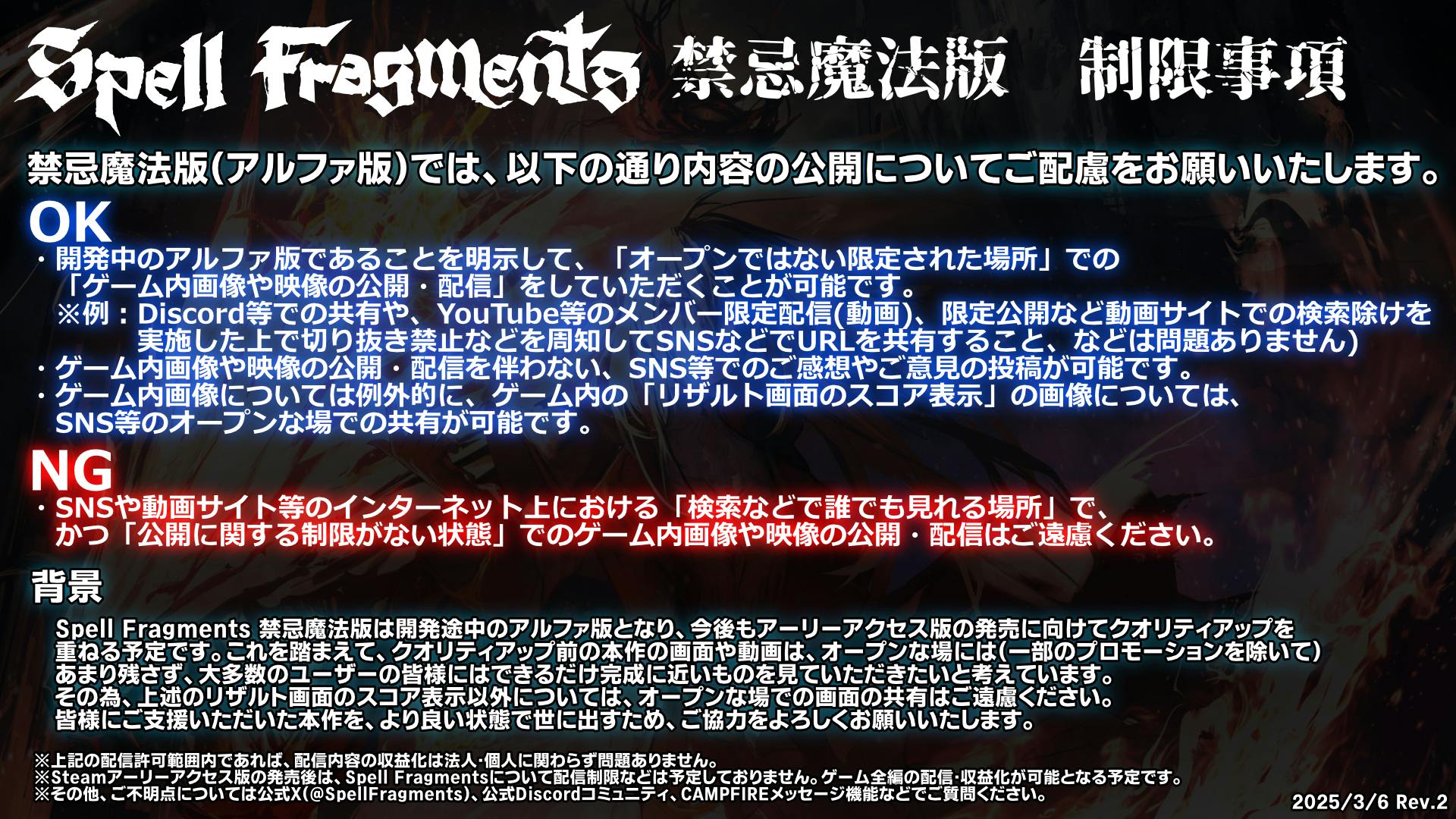 A:Steamでアーリーアクセス版として提供を開始してからは、ゲームの配信などには特に制限を設けません。あくまでも、禁忌魔法版(=開発途中でクオリティアップ前のゲーム)がSpell Fragmentsのクオリティとして広がってしまう、定着してしまうことを避けるための措置です。多くの人に、さらに良くなったSpell Fragmentsを届けたい為、ご協力をお願いいたします。