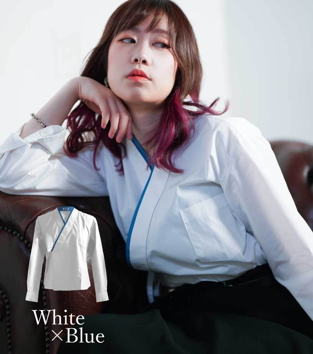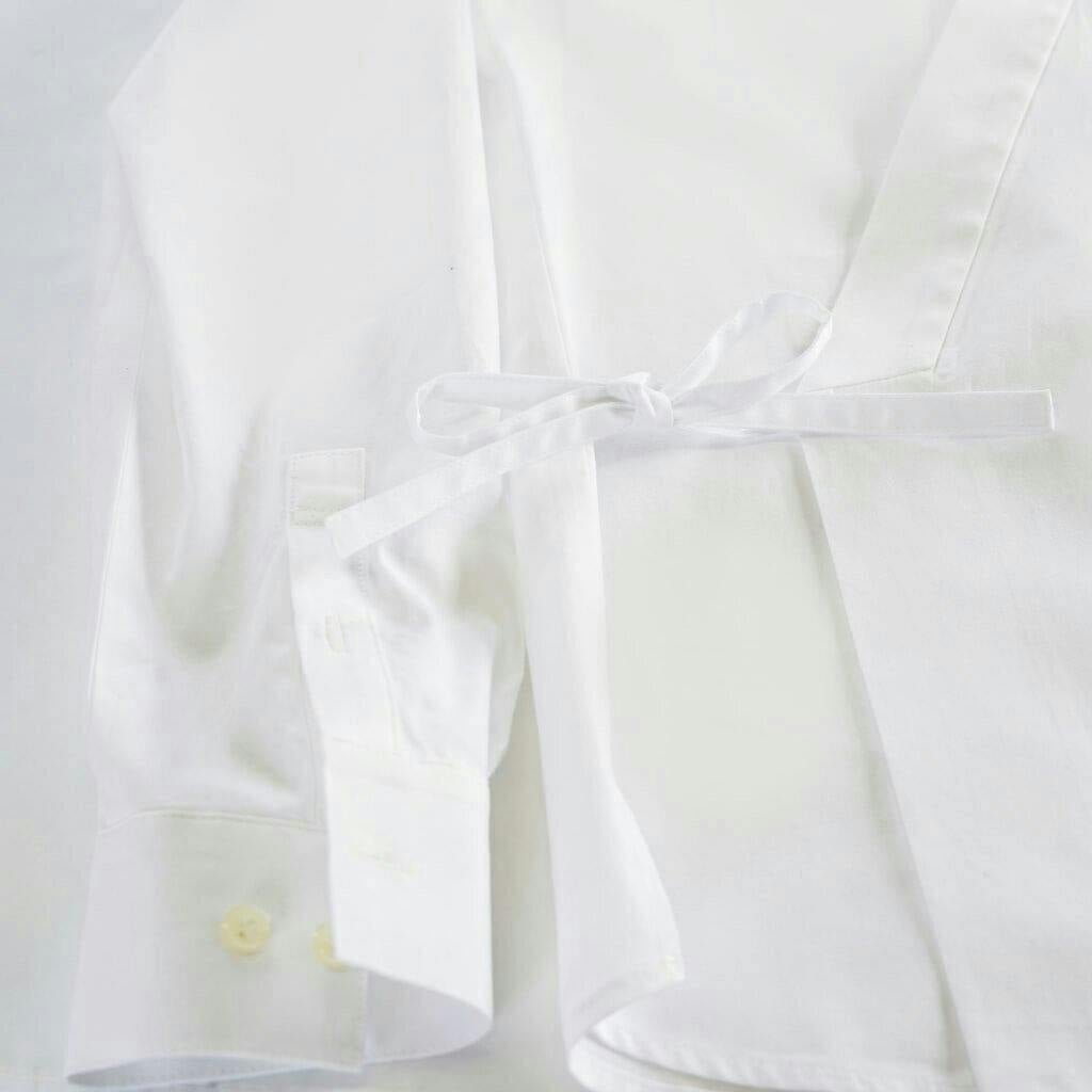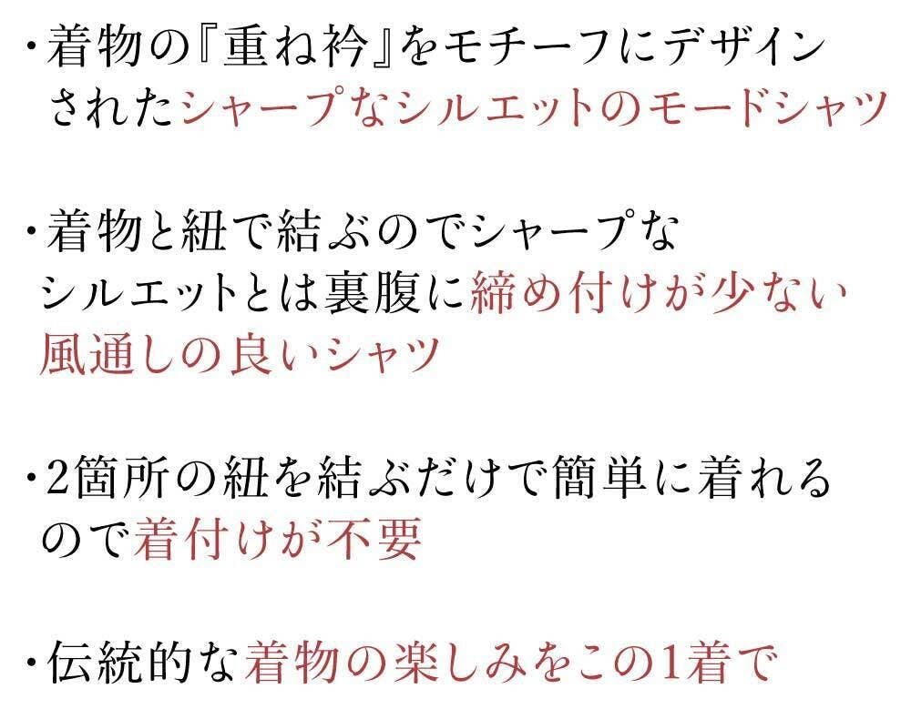 現代のベーシックな西洋のシャツに、着物の衿デザインを採用。一見遠目から見るとベーシックなコットンシャツでフォーマルにもカジュアルにも合わせやすいデザイン。深く入ったVネックが首元を美しく見せます。これまでのShirtシリーズでは、お客様より「カッチリとしたシャープな見た目だけれど、実際に着てみると首元のデザインのおかげで思ったよりも締め付けが無くて涼しい」という感想もいただいています。