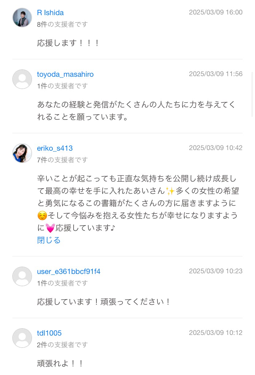 プロジェクトページやブログ、LINEにたくさんの応援コメントを頂いています。