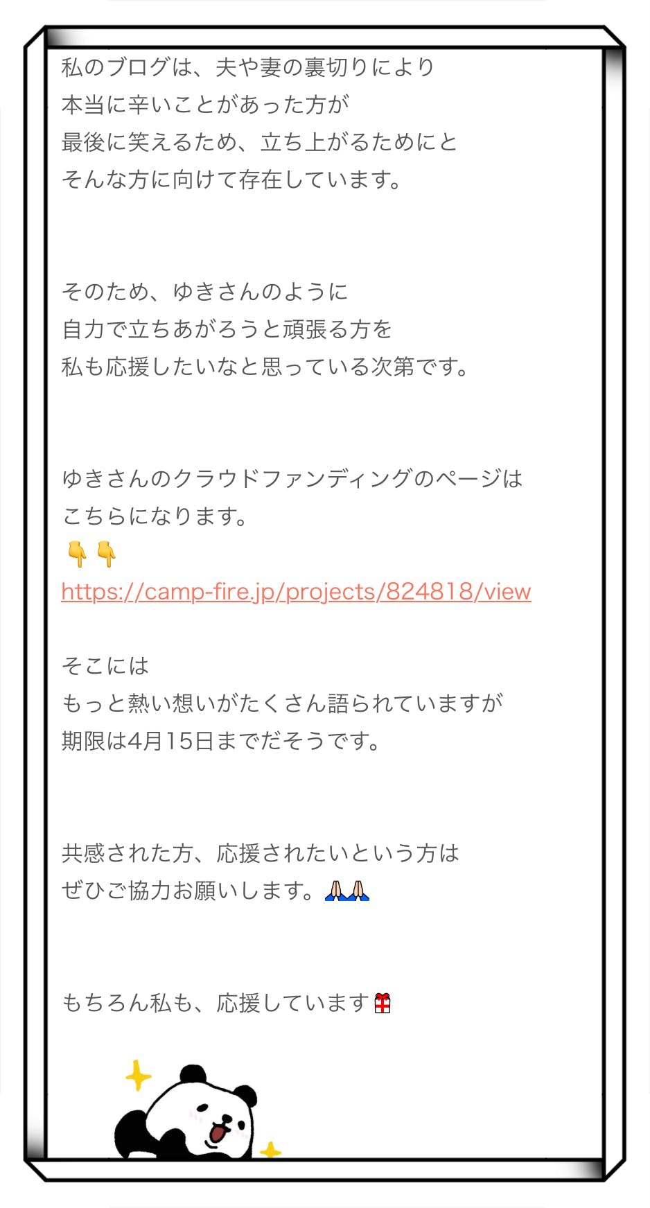 パンダさんは「夫や妻の裏切りにより本当に辛い思いをした人が、最後に笑えるように、立ち上がる力を届けたい」という想いでブログを書き続けています。