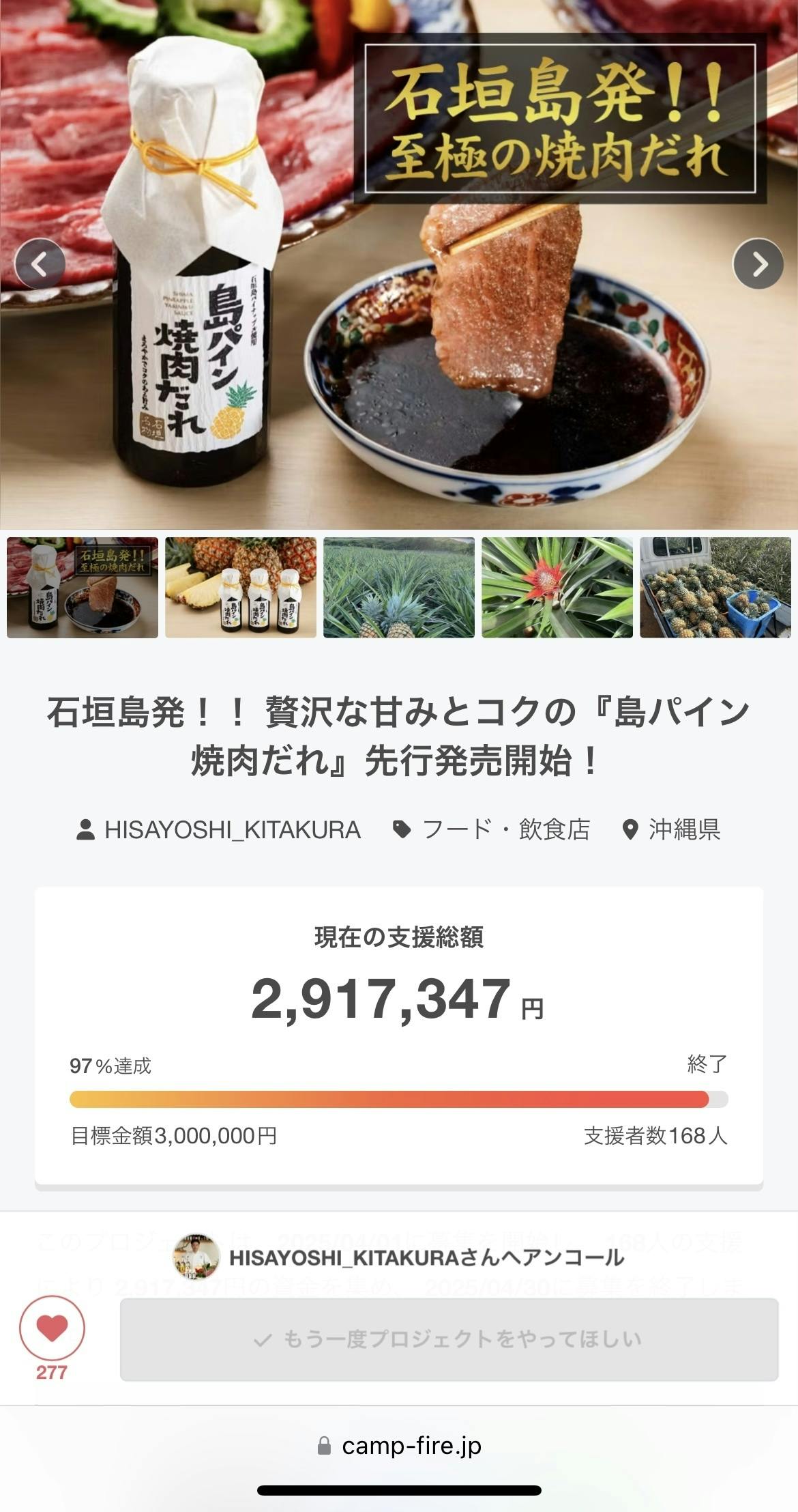 【残り1時間!】おかげさまで「島パイン焼肉だれ」プロジェクト、2,500,000円を超えました!目標まであと少し、ラストスパート中です!まだの方、ぜひこのタイミングで応援いただけたら嬉しいです!