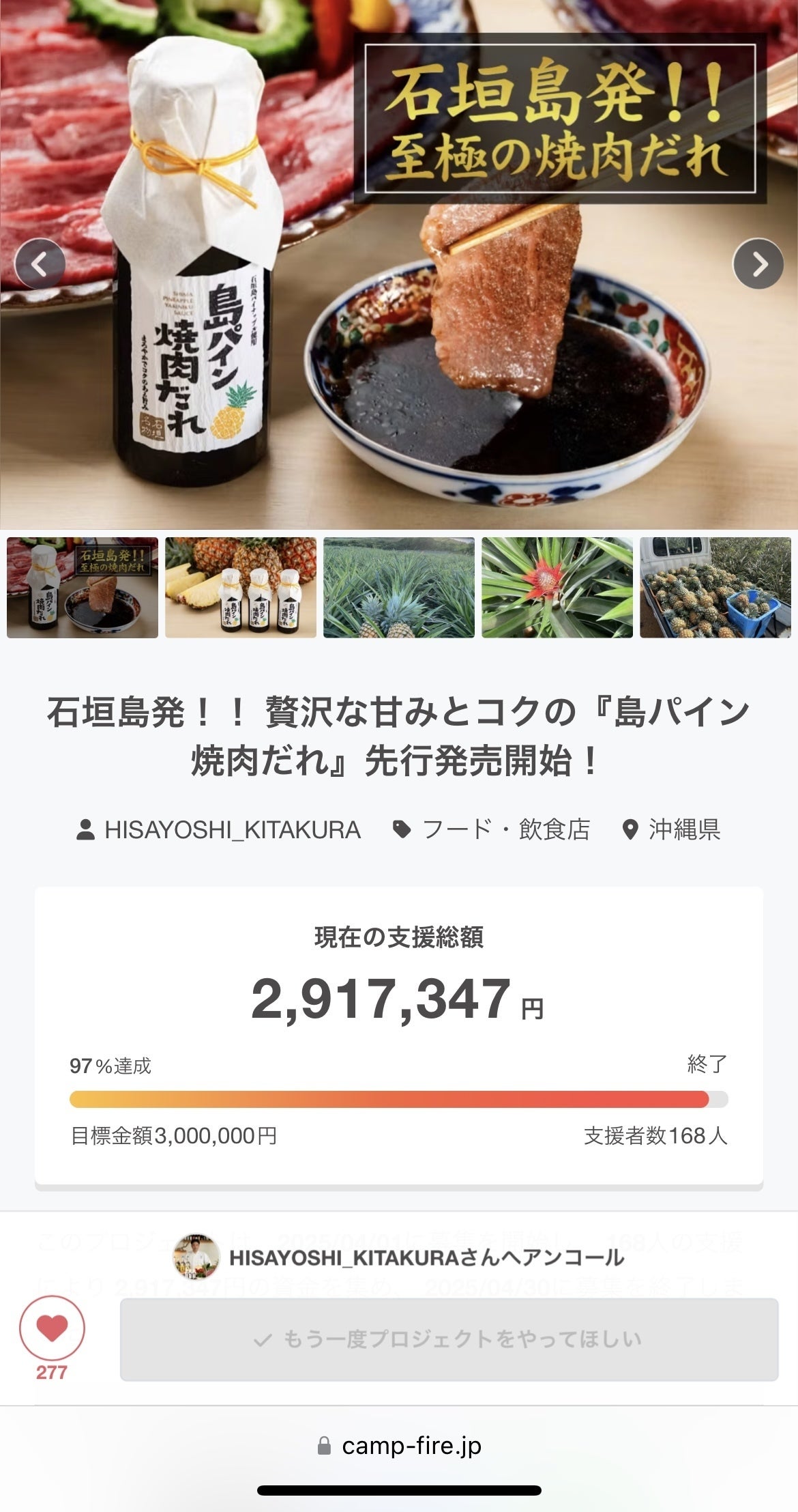 『島パイン焼肉だれ』のクラウドファンディングが、