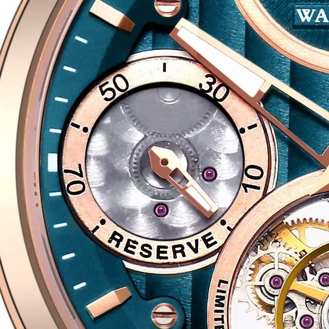 アクアマリンのフェイスとレッドゴールドのケース、そしてロイヤルブルーのベルトの組合せが王者の風格とラグジュアリーな雰囲気を漂わせるモデルです。大人の社交場などで圧倒的な個性を放ち、あなたのセンスの良さを印象付けます。