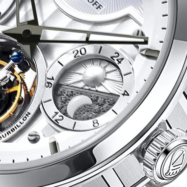 高級腕時計の王道を往くスタンダードなモデルです。フェイスもケースも共にシルバー色で、6時に配したトゥールビヨンのゴールドパーツがお洒落なワンポイントに。