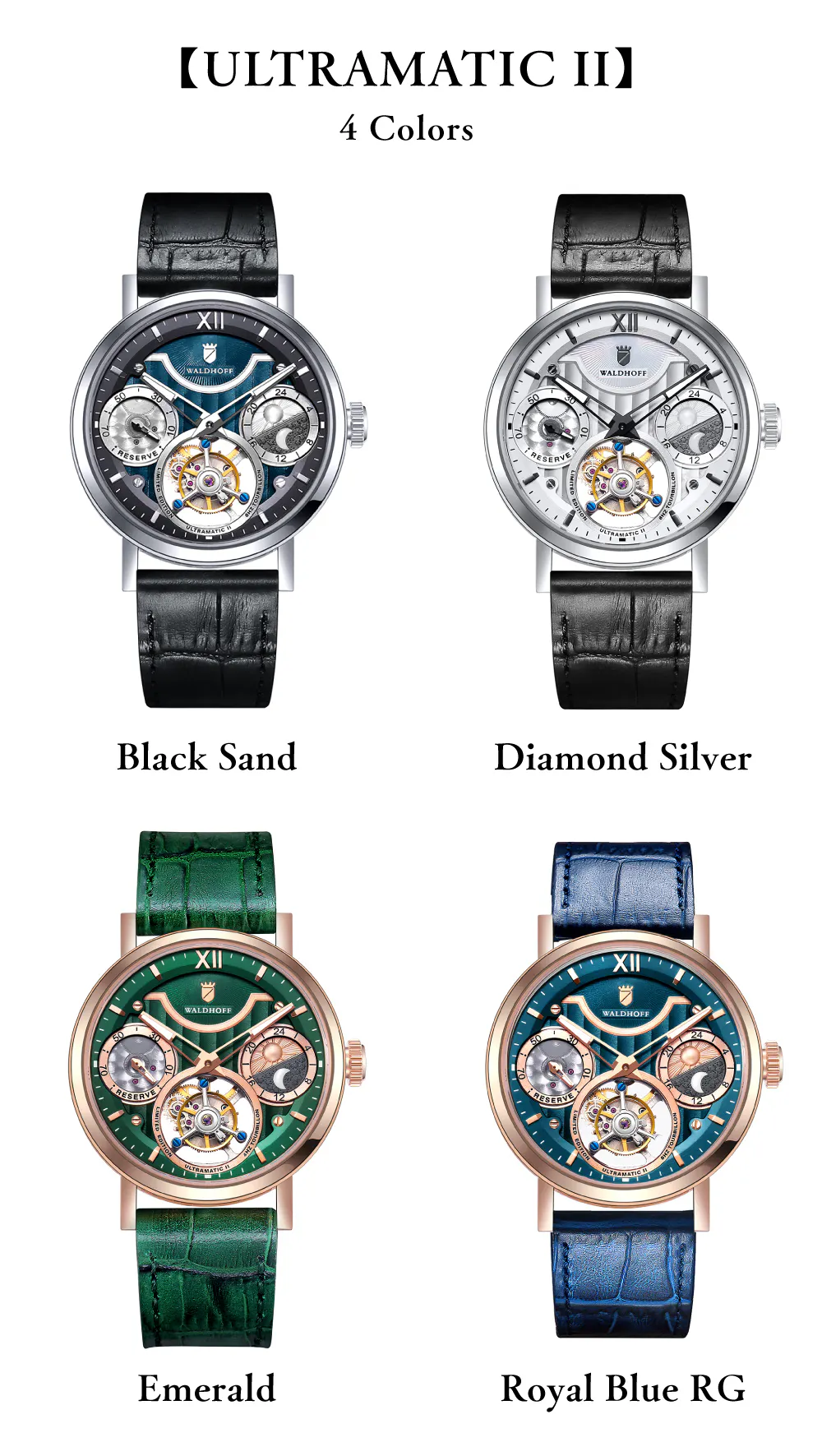 [ULTRAMATIC II ]はBlack Sand(ブラック・サンド)、Emerald(エメラルド)、Diamond Silver(ダイモンドシルバー)、Royal Blue RG(ロイヤル・ブルーRG)の4色をご用意しました。