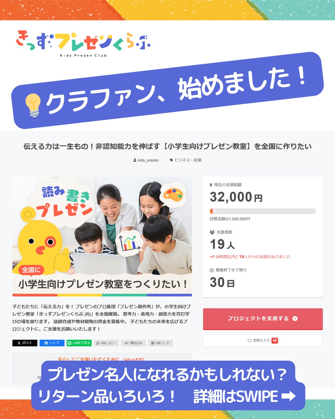こんにちは!きっずプレゼン株式会社の弥山(ややま)です。ついに、クラウドファンディングプロジェクト「伝える力は一生もの!非認知能力を伸ばす【小学生向けプレゼン教室】を全国に作りたい」が3月10日にスタートしました!そして、初日だけで19名の方にご支援をいただきました。温かい応援、本当にありがとうございます!みなさまのご支援を胸に、「教室とオンライン動画のハイブリッドスタイルで、子どもたちにプレゼンの楽しさ&スキルを届ける新サービス」の準備を進めております。より魅力的なプロジェクトにするため、追加のリターン品も検討中です。「こんなリターンがあったら嬉しい!」というアイデアがございましたら、下記SNSのDM等でぜひお寄せください!▶ Instagram:https://www.instagram.com/kids.prezen/▶ Facebook:https://www.facebook.com/kids.prezen▶ X:https://x.com/kids_prezenプロジェクトは4月10日まで続きます。目標達成に向け、引き続きSNSでのフォロー・いいね・シェアや、本プロジェクト情報の紹介等で応援していただけると嬉しいです。これからもどうぞよろしくお願いいたします!