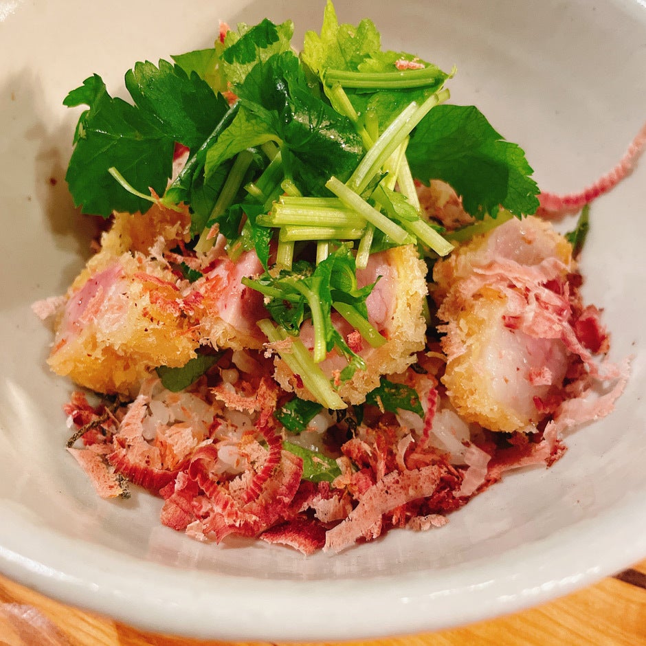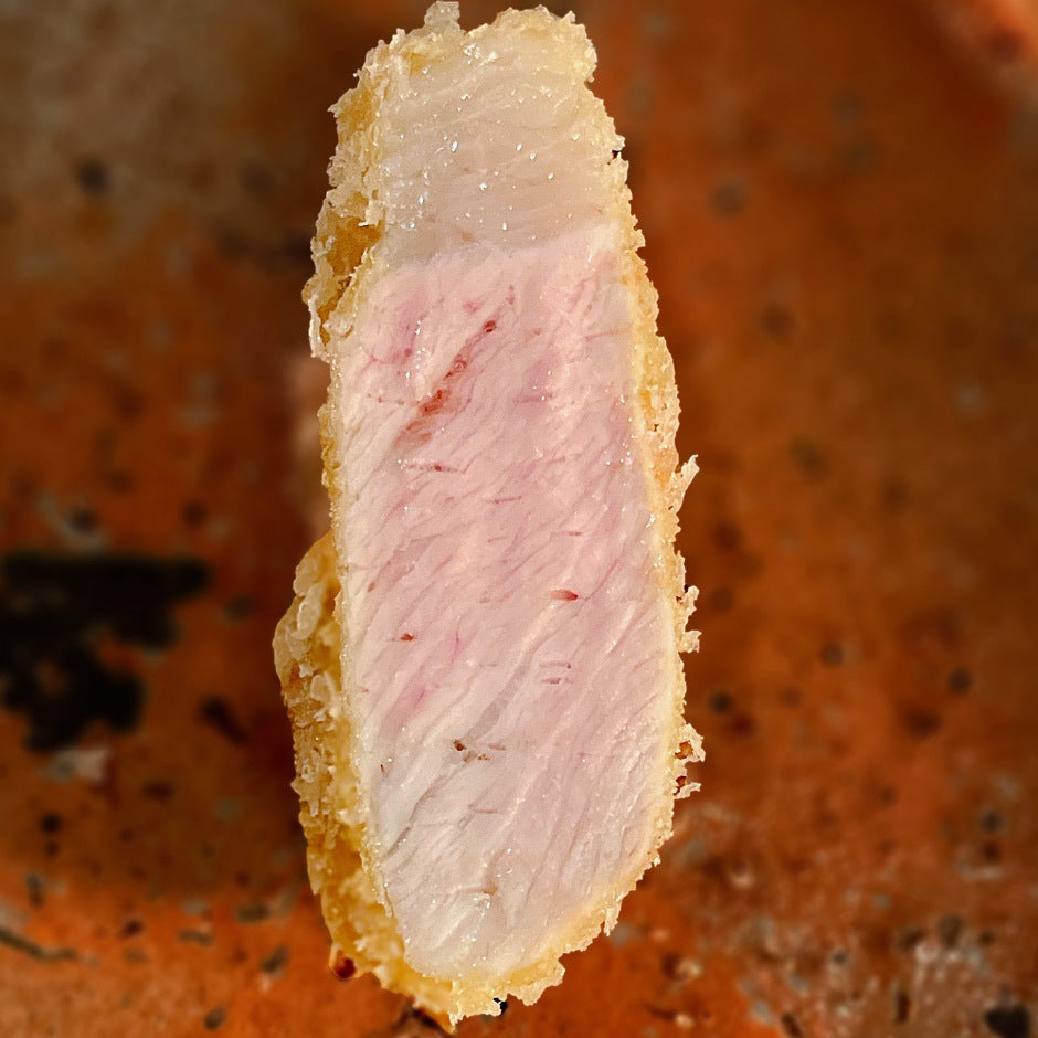 「一番美味しい瞬間に出したい」を追求した結果、鮨屋のようにとんかつを一貫ずつお出しするスタイルを採用しております。また、これには不思議な効果もあります。一貫ずつの食べ比べスタイルを取ることで、最初は苦笑いしていたお客様も部位ごとの脂の香りや歯ごたえ、衣の違いなどに敏感に反応する「利きとんかつ」の舌へと徐々に変貌し、更に料理をお楽しみ頂けるようになるのです。是非お試しあれ。
