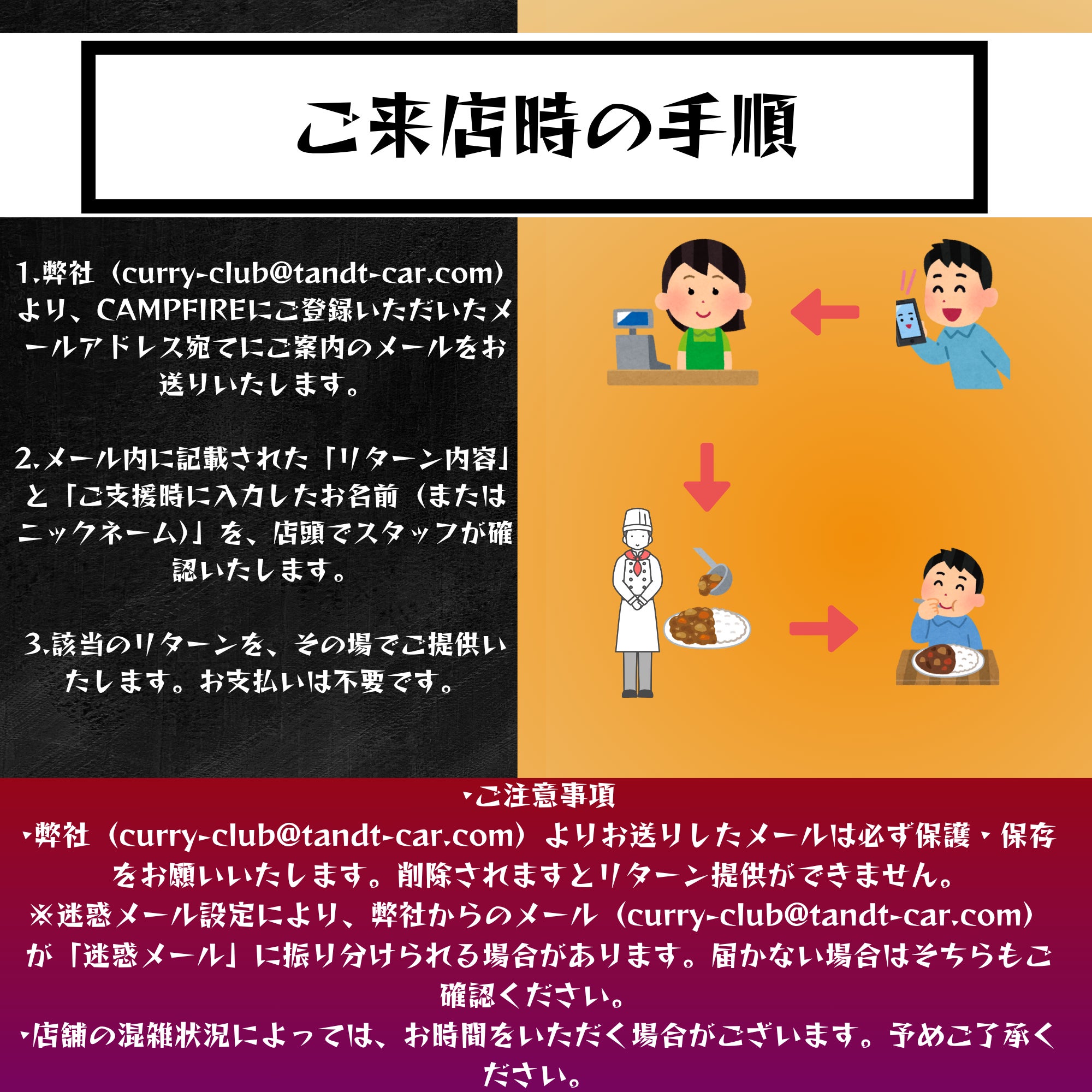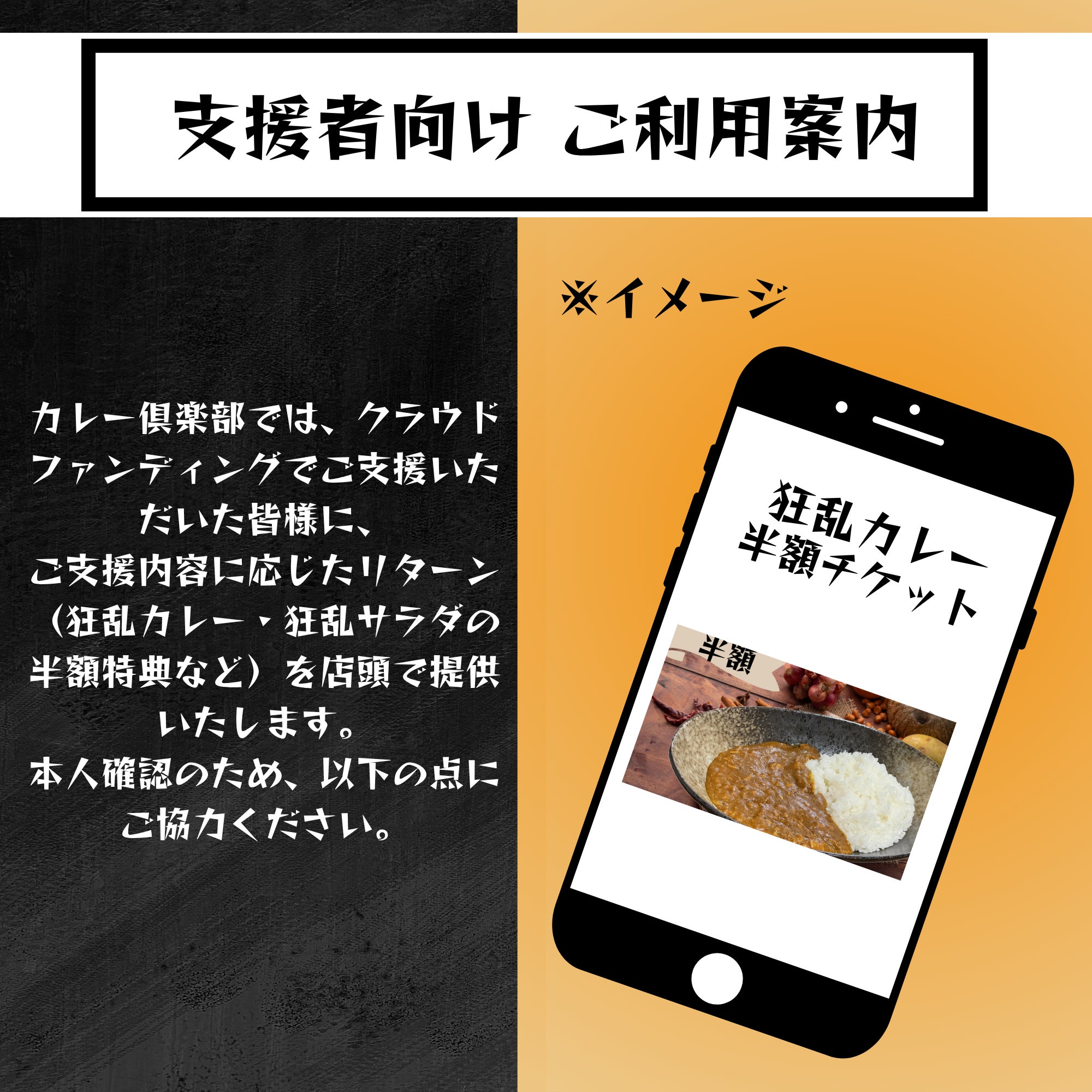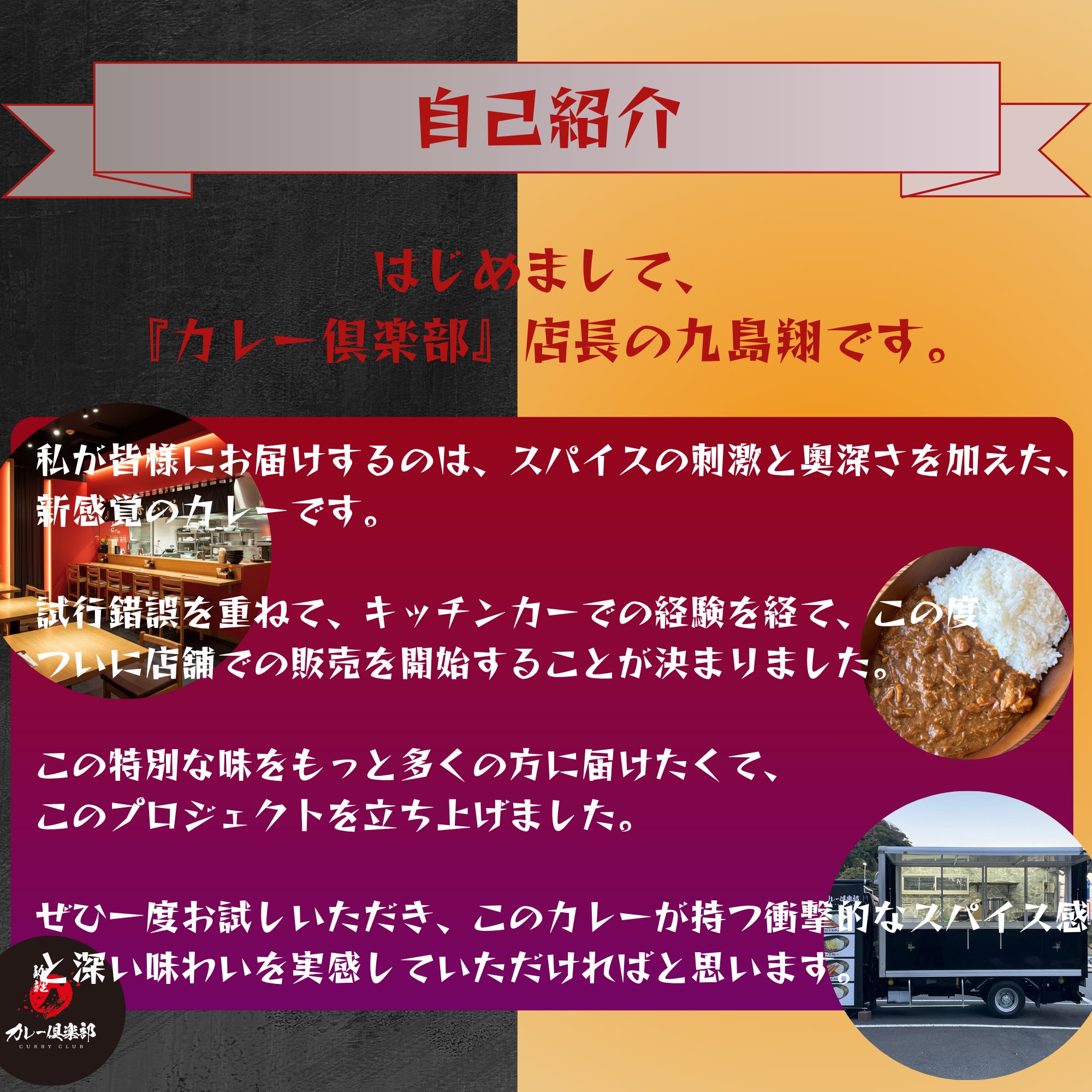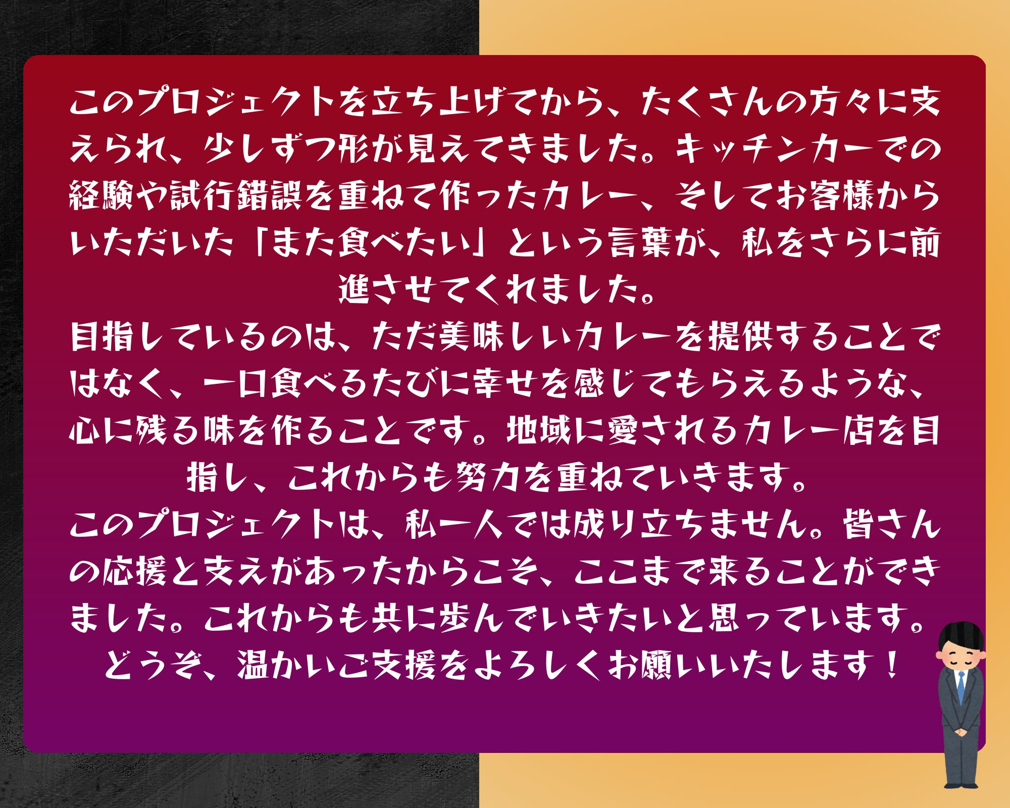 皆さま、温かいコメントとご支援を本当にありがとうございます。 「おいしそう!」「応援しています!」といったお言葉に、大きな励ましと力をいただいております。 皆さまに「支援してよかった」と思っていただけるよう、しっかり準備を進め、最高のカレーをご提供いたします。 クラファンはまだ継続中ですので、もしよろしければご家族やご友人、SNS等でご紹介いただけますと大変嬉しいです。 ▼クラファンページ https://camp-fire.jp/projects/824889/view ▼公式X https://x.com/curryclub0505 ▼公式Instagram https://www.instagram.com/curryclubman ▼公式TikTok https://www.tiktok.com/@curryclubman 今後の進捗は活動報告にてお届けしてまいりますので、引き続き見守っていただけましたら幸いです。 改めまして、心より御礼申し上げます。 カレー倶楽部 店主 九島翔