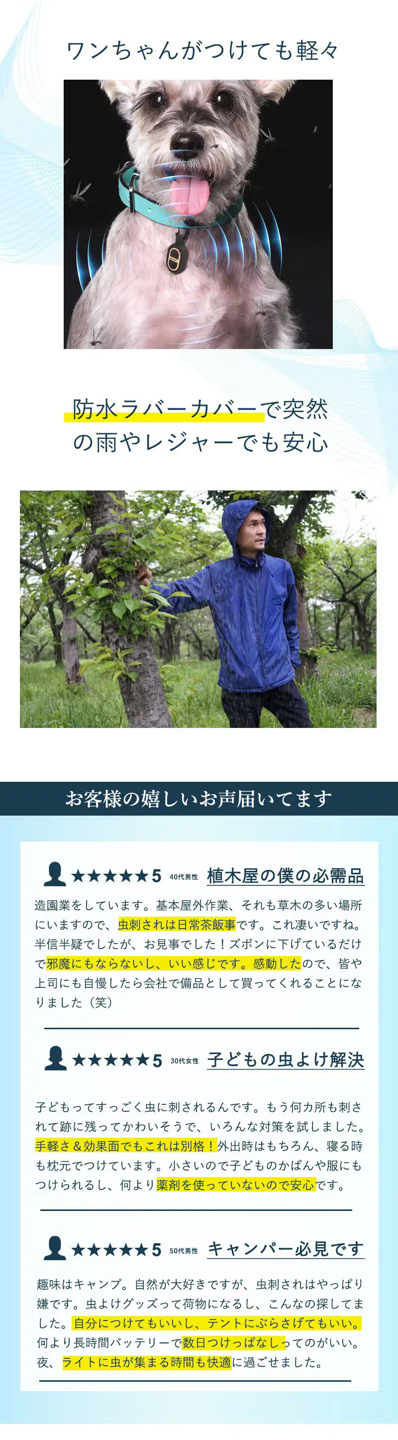 株式会社イーストメディカルは、創業18年を迎えます。この18年の間に様々な変化に対応し、揺るがない信念と高い品質を保持しながら成長を続けて参りました。商品にこだわり全国から健康雑貨・便利雑貨等を仕入れています。薬剤を使わず安全に虫対策が出来る製品を目指し、様々な専門家の意見を聞きながらこの商品を販売する事に至りました。この度販売する商品で、実感して頂きたいと思います。最後に私たちはMOSQUITO REPELLENTを制作するために、製造工場とデザイナー、弊社の3社が一丸となりプロジェクトを誠心誠意進めています。 本文中に記載させていただいたスケジュールは、あくまでプロジェクト公開時点の予定です。 ご支援の性質上、ご支援の数が想定を上回った場合、製造工程上の都合や、配送作業に伴う止むを得ない事情によりお届けが遅れる場合がございます。 ・仕様、デザイン等、一部変更になる場合がございます。 あらかじめご了承下さい。 ※本プロジェクトを通して想定を上回る皆様からご支援頂き、現在進めている環境から量産体制を更に整えることができた場合、正規販売価格が販売予定価格より下がる可能性もございます。 ※原則として、配送遅延に伴うご支援のキャンセルはできませんが、リターン配送予定月から3ヵ月を超えた場合には、希望者に限りキャンセルにて対応させていただきます。 本製品を手に取った皆様に喜んでいただけるよう、弊社スタッフ一同、心を込めてご対応いたしますので、ご支援くださいますよう宜しくお願い申し上げます。