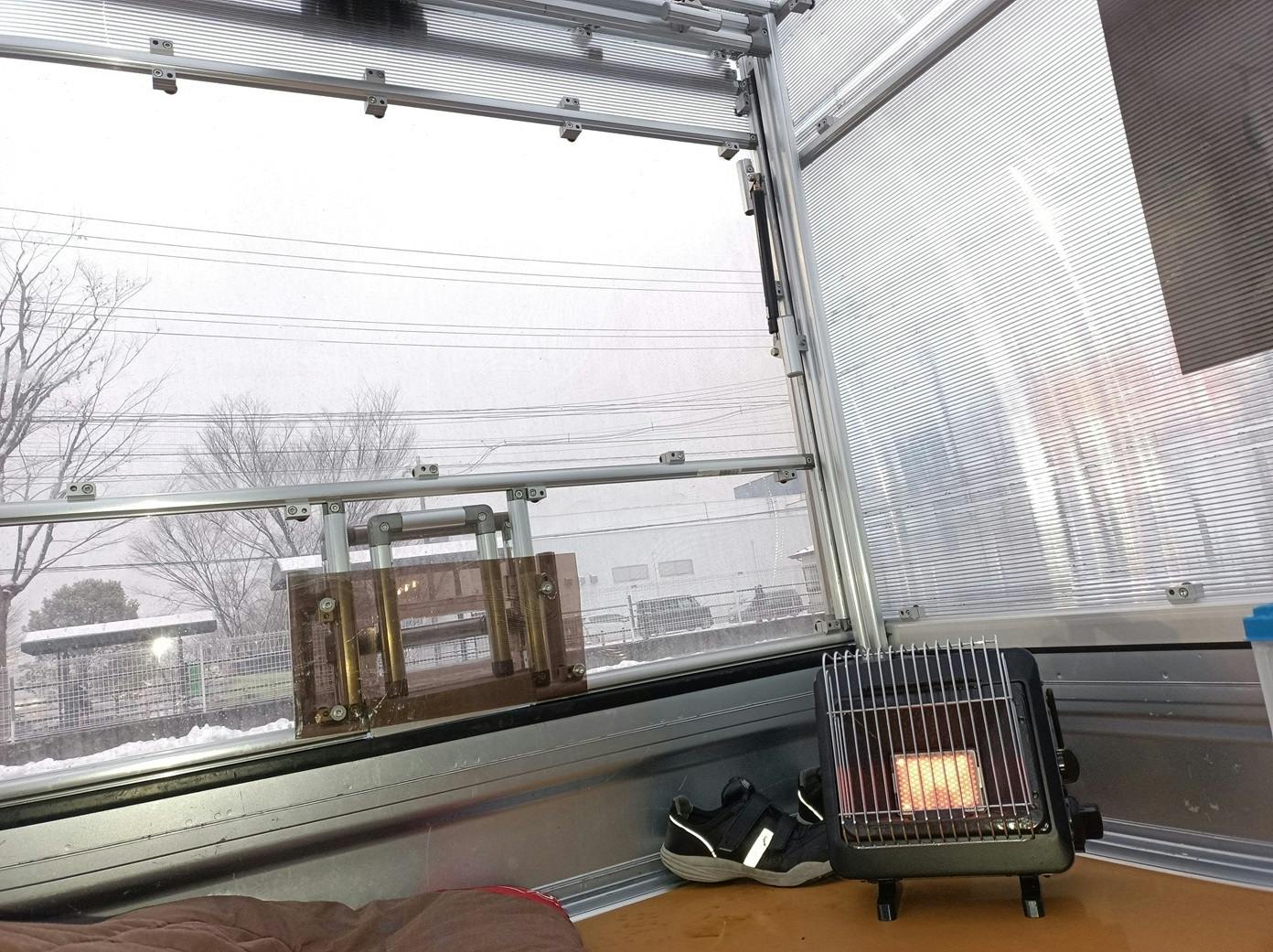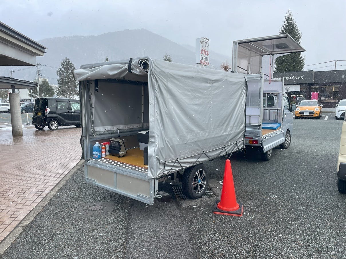 寒い日が続いていますが、休憩時間には軽トラの荷台でゴロゴロしています。寝袋も完備で快適です。