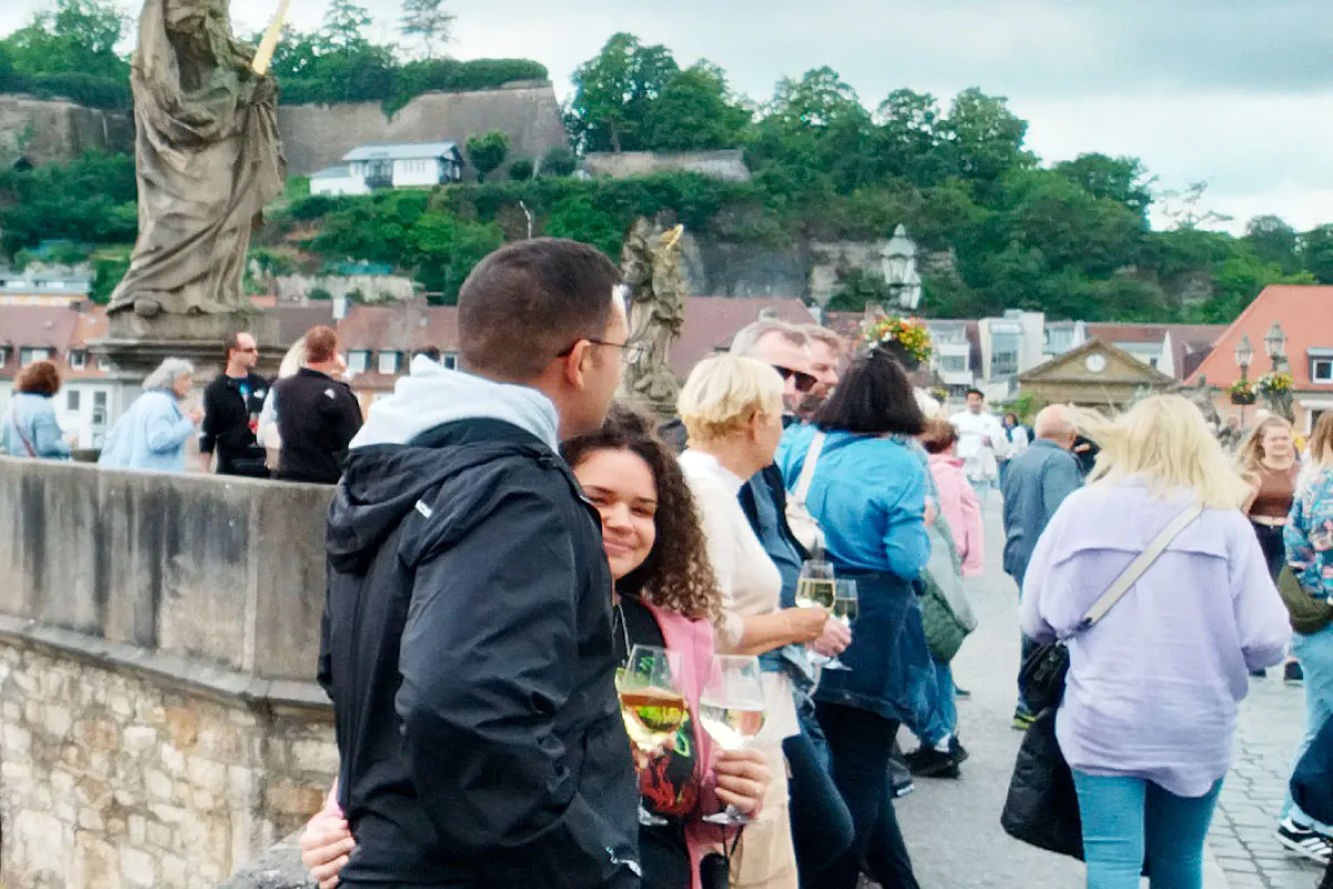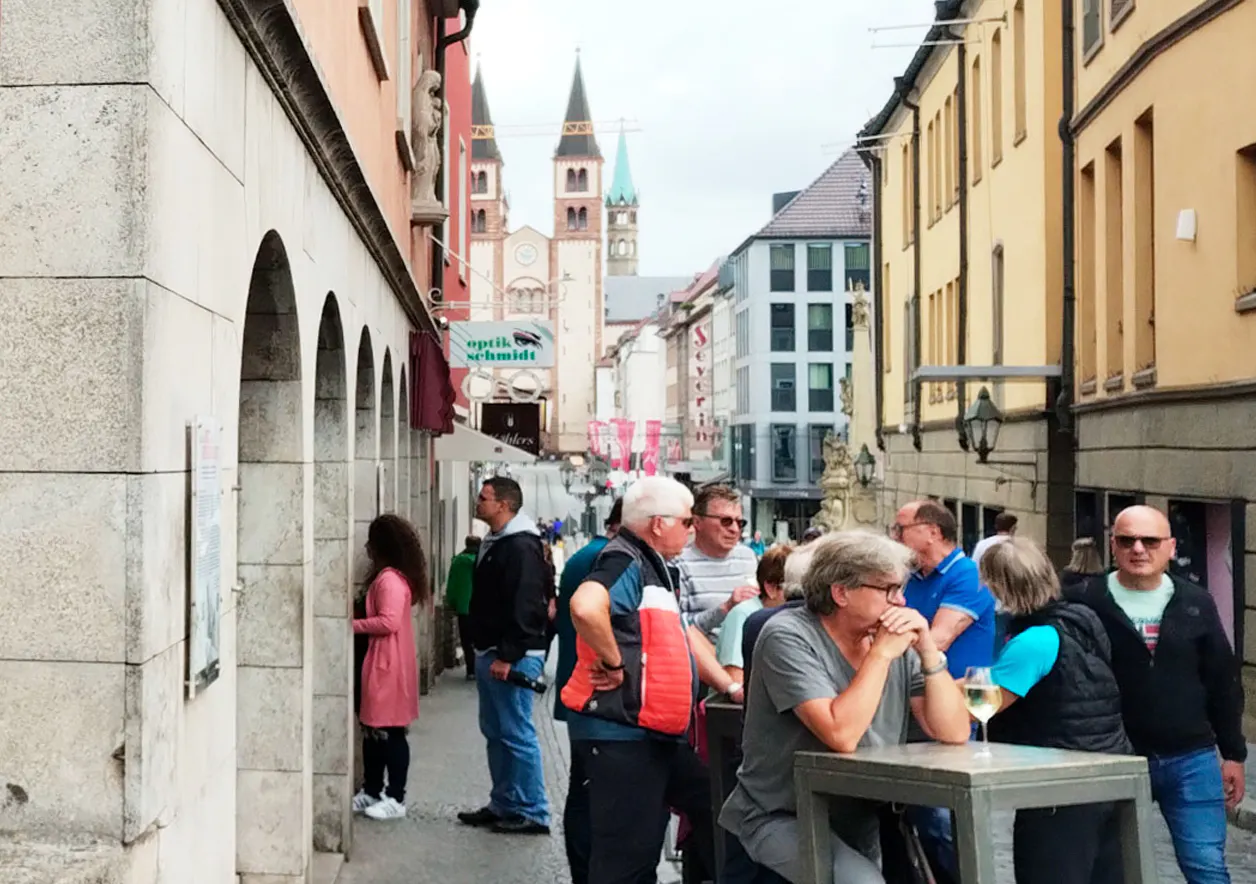 【ドイツ バイエルン州ヴュルツブルグ 道端でワインを楽しむ人々】