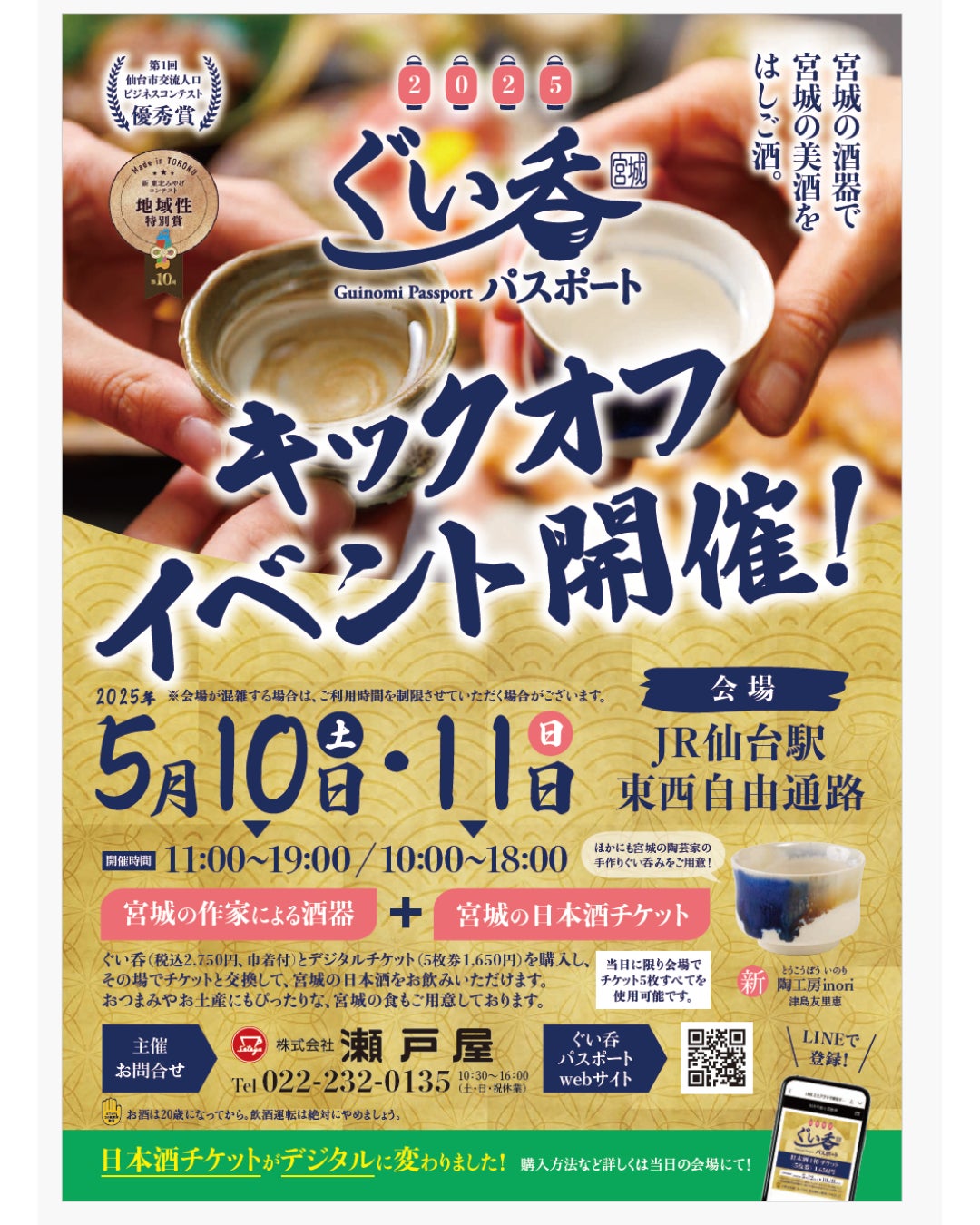 2025/04/22 08:27おはようございます。5月10日、11日のキックオフイベントのチラシが出来ました!日にち 5月10日(土)、11日(日)時間 5月10日(11:00~19:00) 5月11日(10:00~18:00)場所 仙台駅東西自由通路陶芸家 針生峻、陶工房inori(両日)酒蔵 1日目 一ノ蔵 2日目 田中酒造当日は立ち飲みスペース(角打ち)を作り、その場でチケットを使用して日本酒を飲むことが出来ます!2日間はチケット何枚でも使えるようになっておりますので、地元宮城の日本酒を飲み比べしてみてください。当日は酒蔵さん、陶芸家さんも販売にいらっしゃいます。作り手の方々とふれあいながら飲むことが出来ます!仙台駅の通路での立ち飲みはめったに出来ませんので、是非ご来場ください! もっと見るデジタルチケット開発進捗状況
