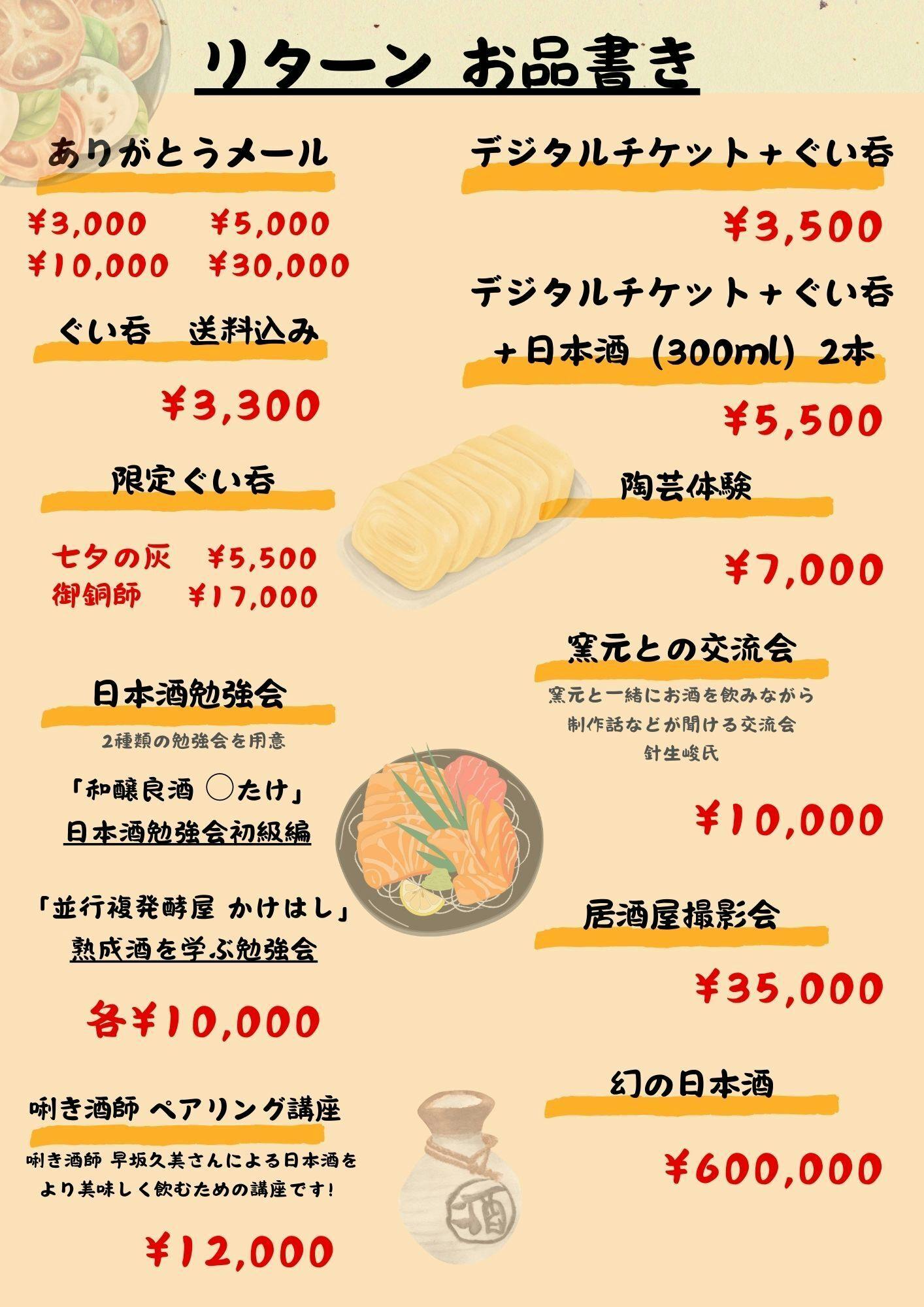 ぐい呑みパスポートでは、特別な体験をお届けする様々な魅力的なリターンをご用意しました!何回かに分けてご案内いたします!!