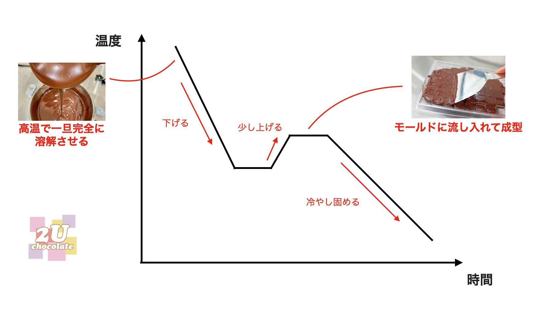 「テンパリング」とはチョコレートを冷却固化させる際の温度調整の操作のことで、溶けたチョコレート生地の温度を下のグラフのようにコントロールして冷やし固めることでココアバターの結晶が整い、ツヤのある見た目とパキッと割れる硬さを持ったチョコレートができあがります。