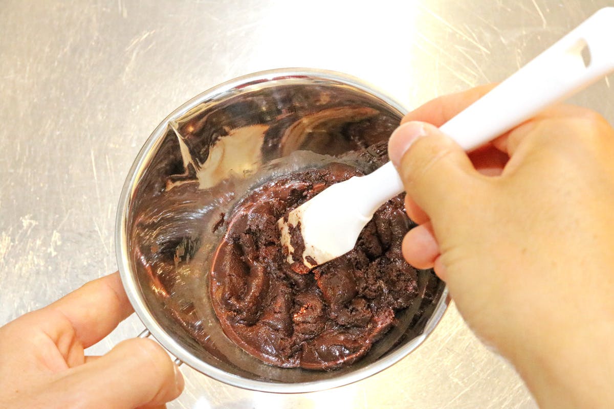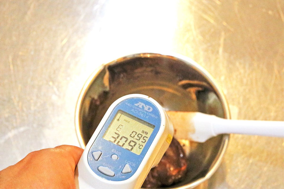 ワークショップで作るチョコレート生地の粘度が非常に高いため、全体を均質に混ぜながら温度変化させていくことが難しいからです。