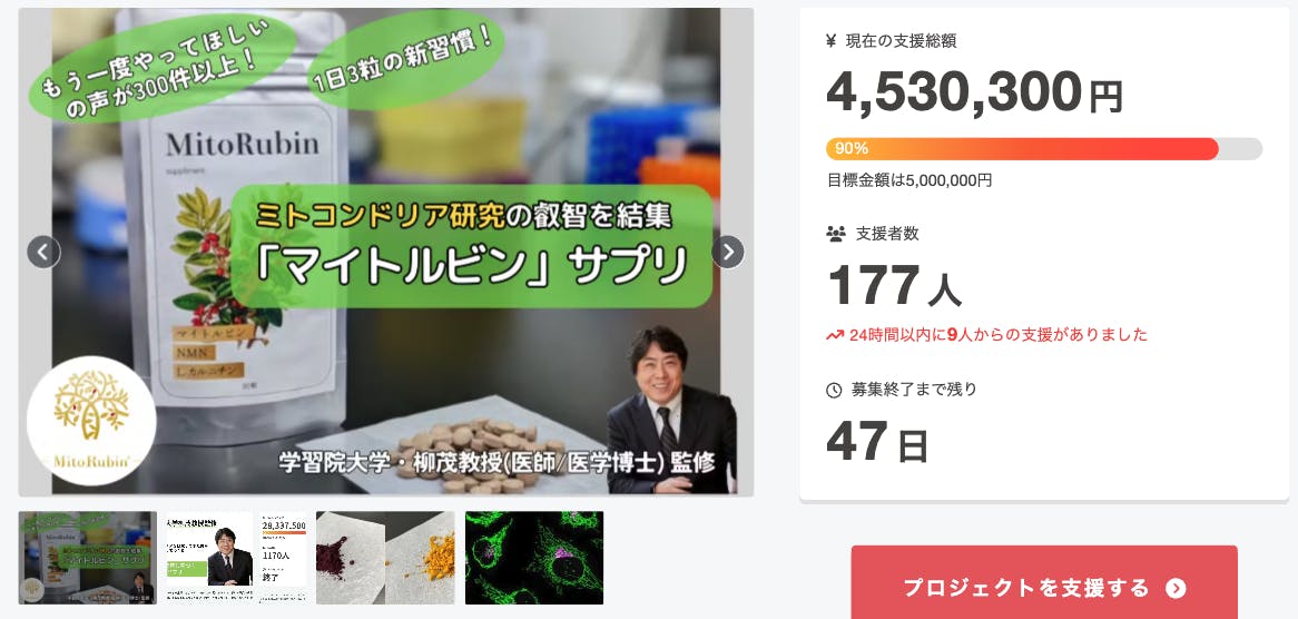 プロジェクトでは引き続き100%達成を目指しつつ、それを通過点として、残り期間も挑戦を続けてまりいます。そして、今後のマイトルビンのエイジングケア研究の加速、さらにアップデート版サプリの研究開発にも取り組み、一人でも多くの方に「マイトルビン」をお届けしてまいります。