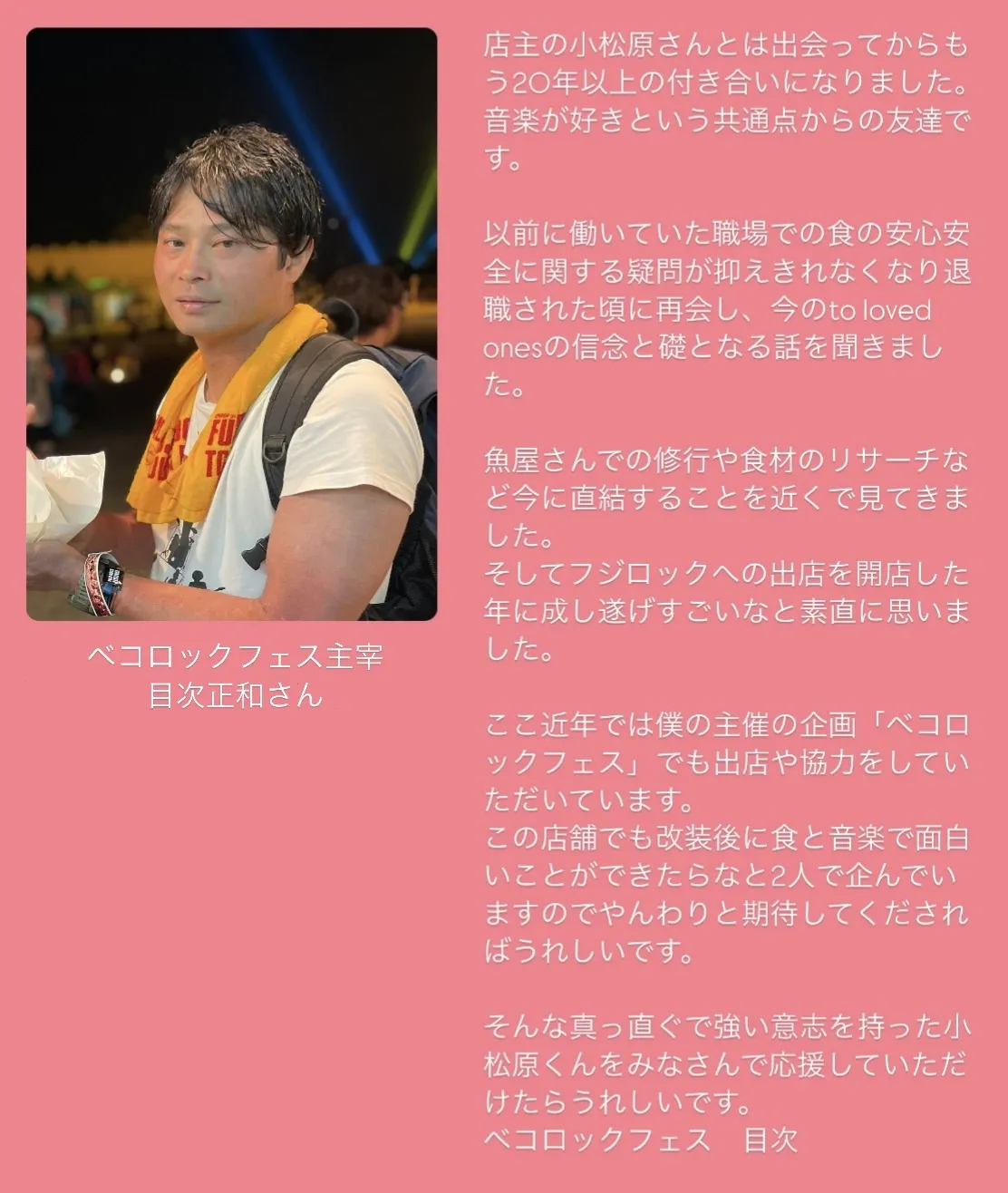 25年来の友人の目次さん。バイト時代に出会いお互いに音楽好きでずっと仲良しです。目次さんの音楽好きが高じて始められた「ベコロックフェス」。バンド愛溢れるベコロックは毎回本当に最高で、沢山のエネルギーを与えていただきました。そして近年では出店でお手伝いさせていただいてます。これからは2人でもっと楽しい事が出来たらと会う度に計画を立てています!目次さん、今回は応援メッセージ、本当にありがとうございます!