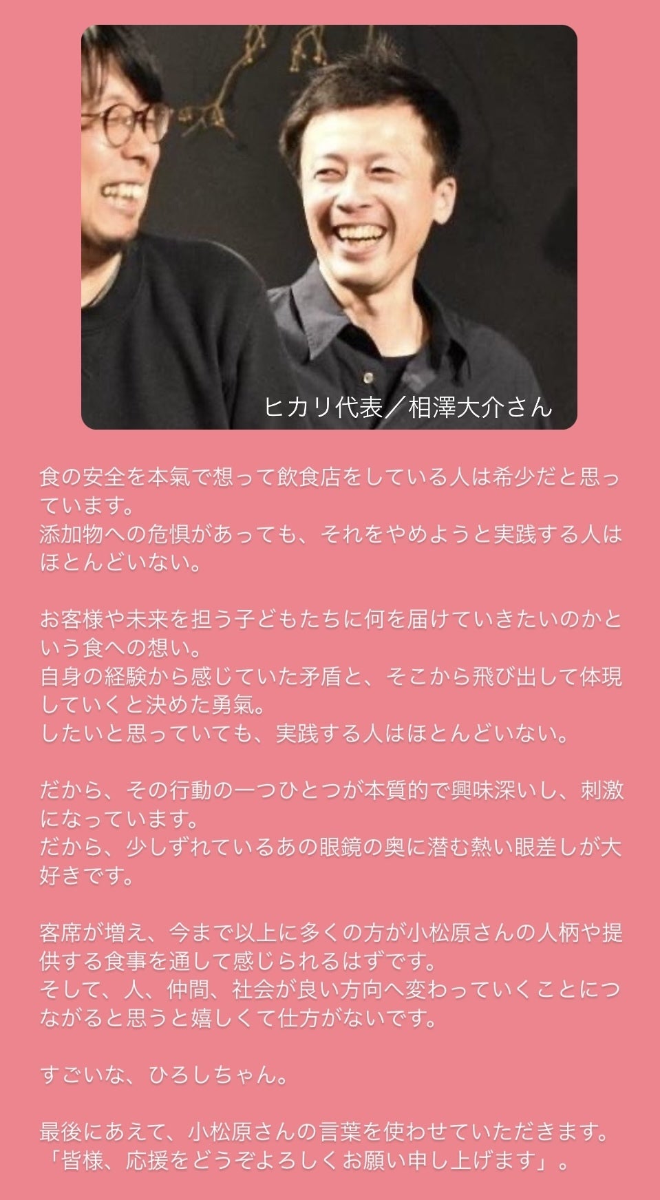 25年来の友人の目次さん。バイト時代に出会いお互いに音楽好きでずっと仲良しです。目次さんの音楽好きが高じて始められた「ベコロックフェス」。バンド愛溢れるベコロックは毎回本当に最高で、沢山のエネルギーを与えていただきました。そして近年では出店でお手伝いさせていただいてます。これからは2人でもっと楽しい事が出来たらと会う度に計画を立てています!目次さん、今回は応援メッセージ、本当にありがとうございます!