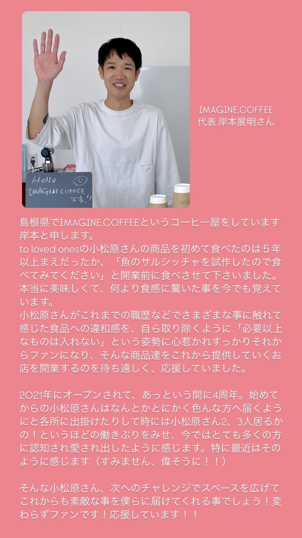 改めましてto loved ones 代表の小松原です。