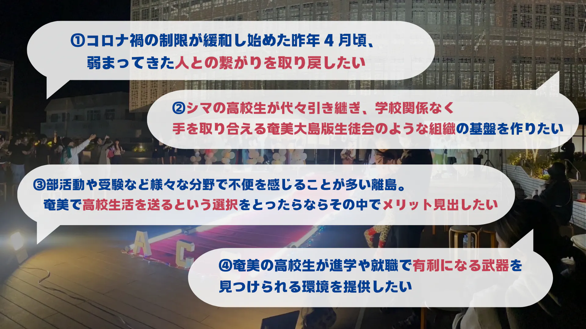奄美大島で学生生活を過ごす地元の高校生が主体となって活動している学生団体です。