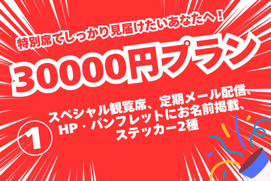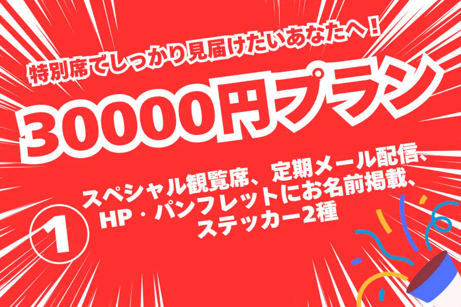 スペシャル観覧席+定期メール配信+HP・パンフレットにお名前掲載+ステッカー2種の提供