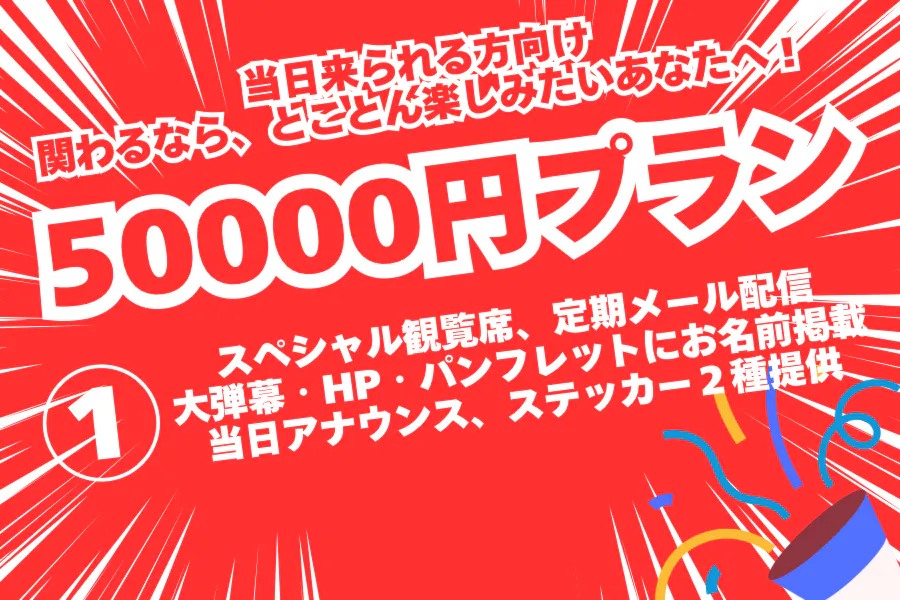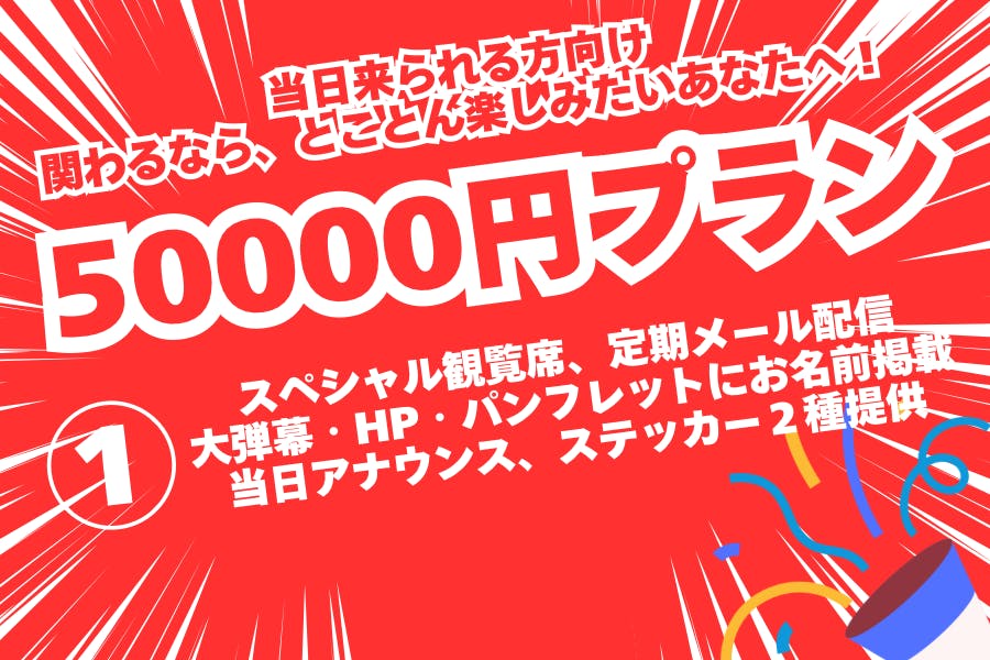 スペシャル観覧席+定期メール配信+大弾幕・HP・パンフレットにお名前掲載+当日アナウンス+ステッカー2種提供当日、大通り商店街に大弾幕を設置します。その大弾幕にお名前を掲示いたします。また、当日のアナウンスで高額支援者としてアナウンスをさせていただきます。※観覧席は譲渡可能です!