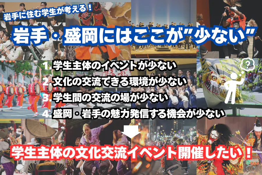 岩手には、学生が自らの力で未来を創り出す場がまだ十分にありません。地域では様々な行事が開催されていますが、学生が主役となり、夢やアイデアを形にする機会は限られています。これは、若者の情熱や可能性が十分に発揮されていない現状とも言えます。