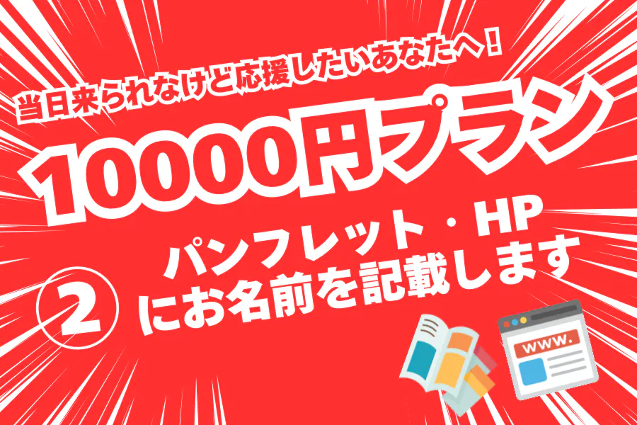 パンフレット・HPにお名前を記載します!パンフレット・HPにお名前掲載+パンフレット・感謝状郵送当日、会場図やタイムテーブルをのせたパンフレットを来場者の皆様に配布します。協賛や後援と同じ枠に皆様のお名前をお書きします。後日、パンフレットと感謝状を郵送させていただきます!