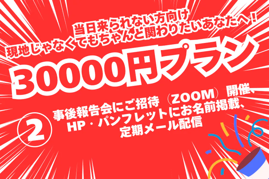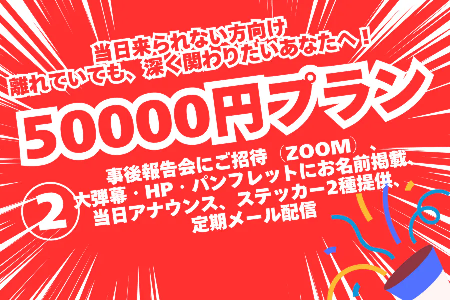 事後報告会にご招待(ZOOM)+定期メール配信+大弾幕・HP・パンフレットにお名前掲載+当日アナウンス+ステッカー2種提供 当日、大通り商店街に大弾幕を設置します。その大弾幕にお名前を掲示いたします。また、当日のアナウンスで高額支援者としてアナウンスをさせていただきます。大弾幕は写真、アナウンスは録音させていただき後日メールで当日の様子をお伝えさせていただきます。
