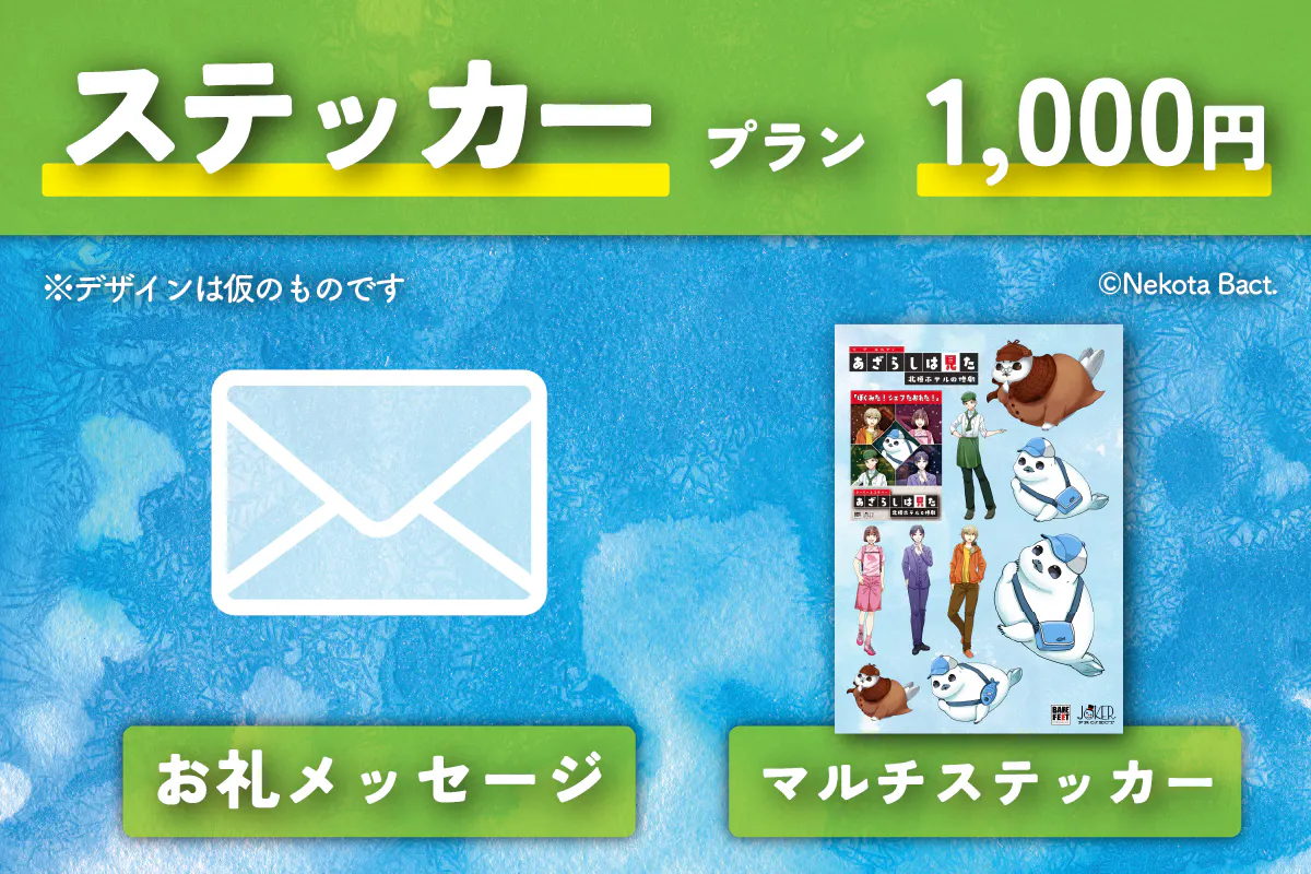 CAMPFIRE内のメッセージ機能によるお礼メッセージと、『あざらしは見た』特製マルチステッカーをお届けいたします。