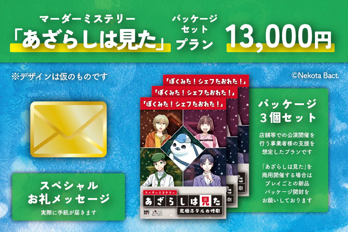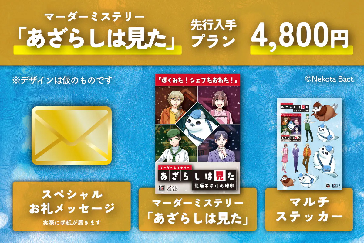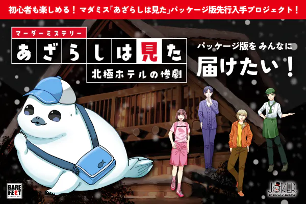 このプロジェクトを通して、たくさんの方にJOKER PROJECTが作る”あざらしコンテンツ”を知ってもらいたい、マーダーミステリー『あざらしは見た』パッケージ版を制作しより多くの方にお届けしたい、と考えております。
