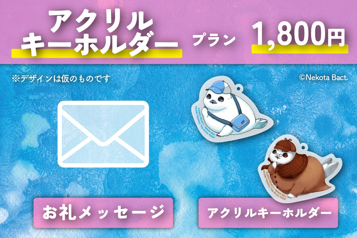 CAMPFIRE内のメッセージ機能によるお礼メッセージと、『あざらしは見た』特製アクリルキーホルダー2種をお届けいたします。