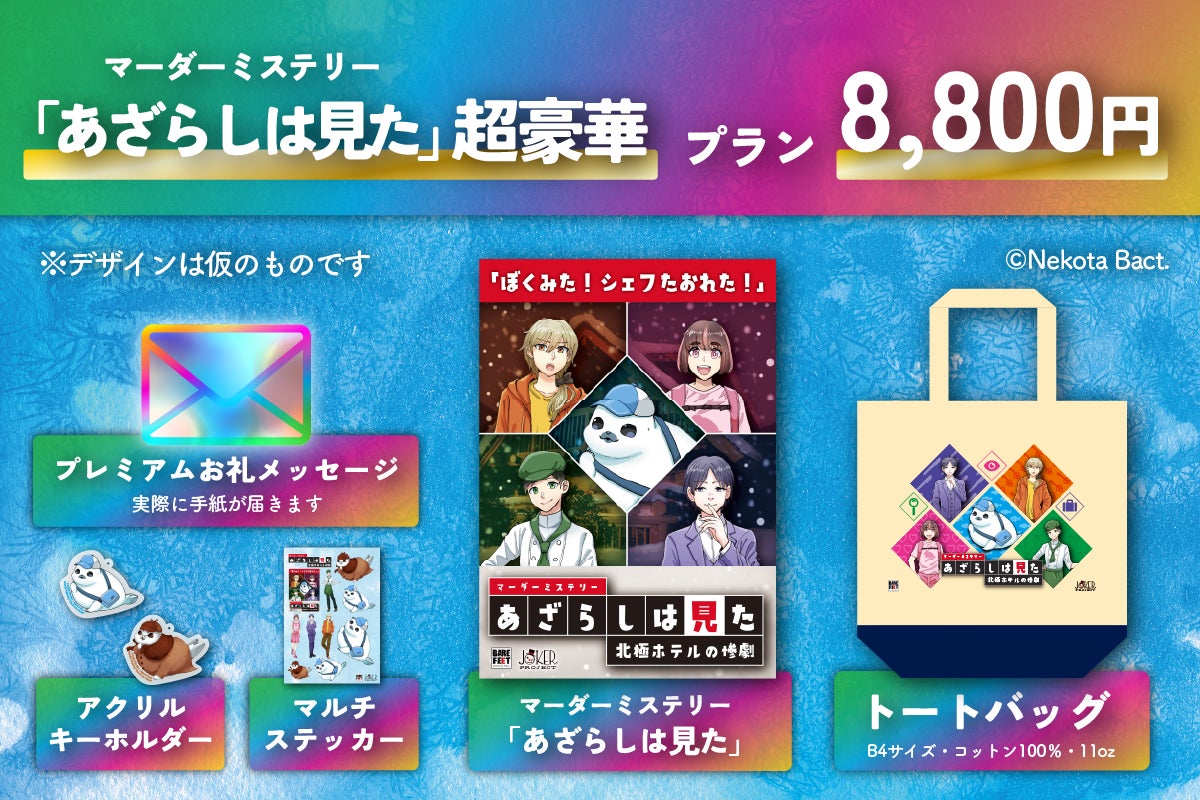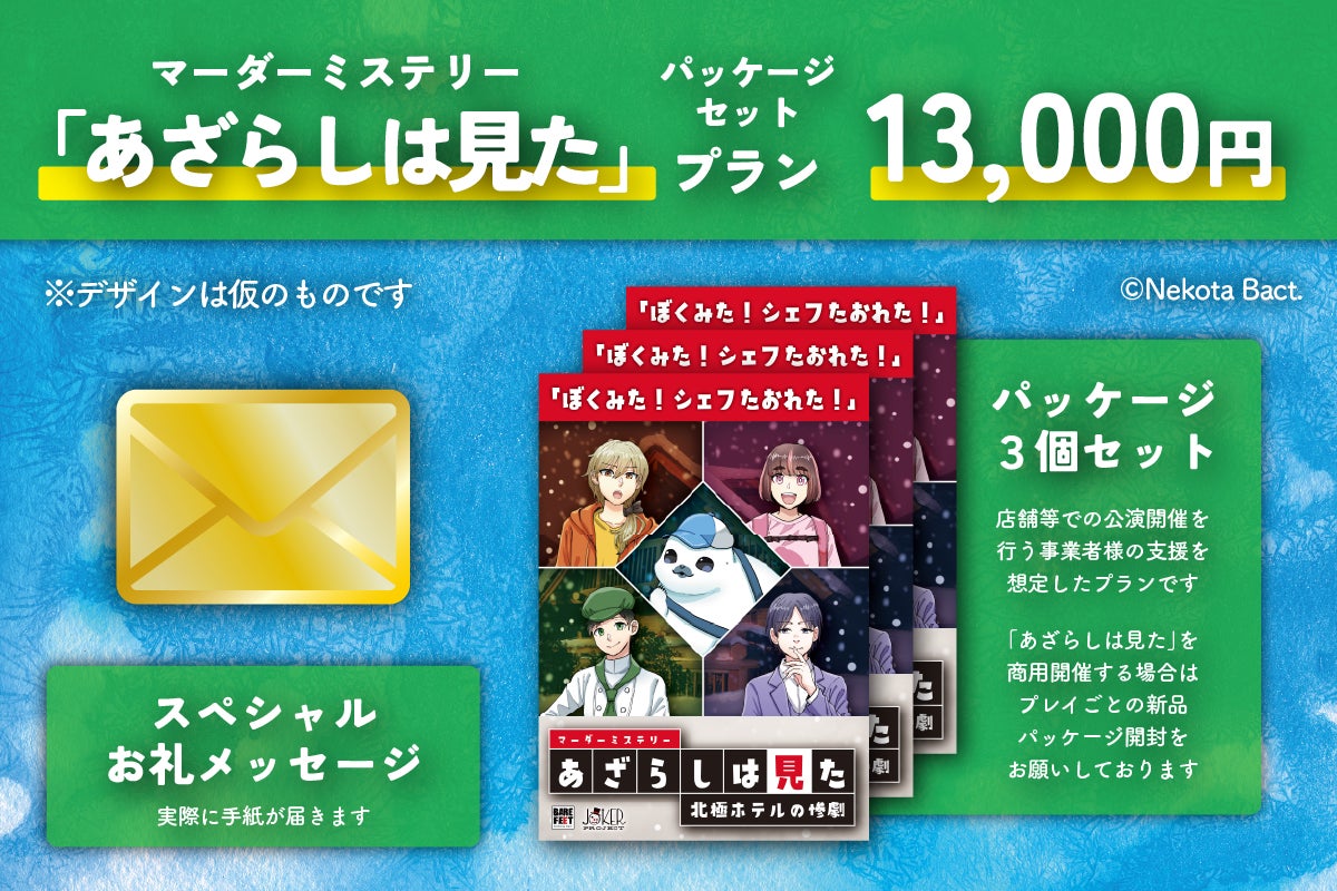 このプロジェクトを通して、たくさんの方にJOKER PROJECTが作る”あざらしコンテンツ”を知ってもらいたい、マーダーミステリー『あざらしは見た』パッケージ版を制作しより多くの方にお届けしたい、と考えております。