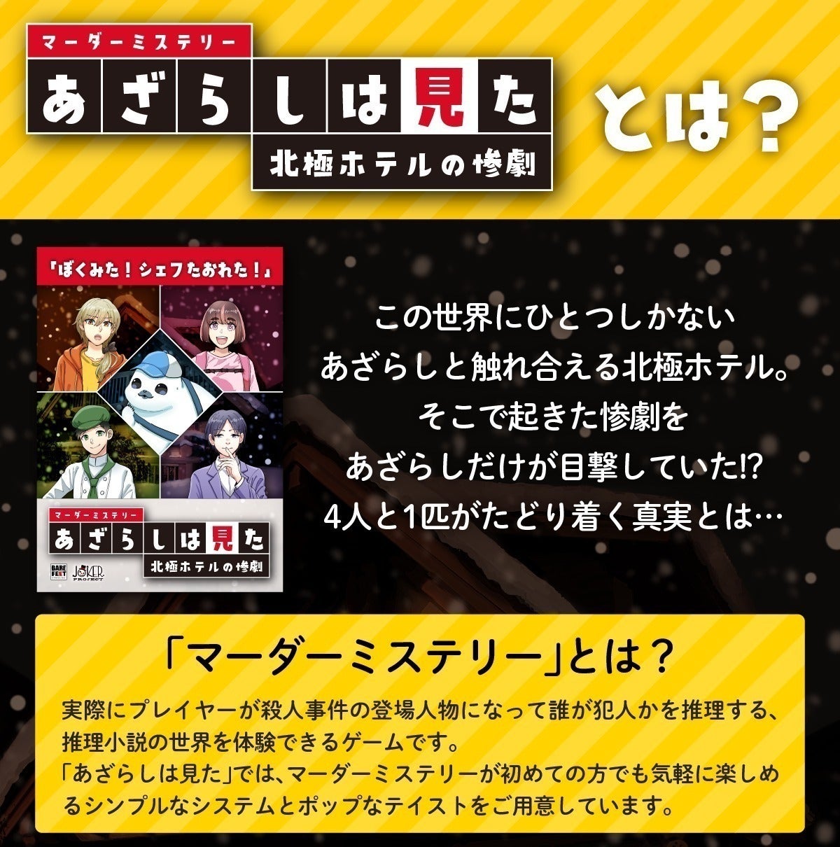 マーダーミステリー『あざらしは見た』は2025年11月のゲームマーケット2025秋頃には一般販売予定ですが、このクラウドファンディングが1番早く、そしてオトクに手に入れられる機会となっております。