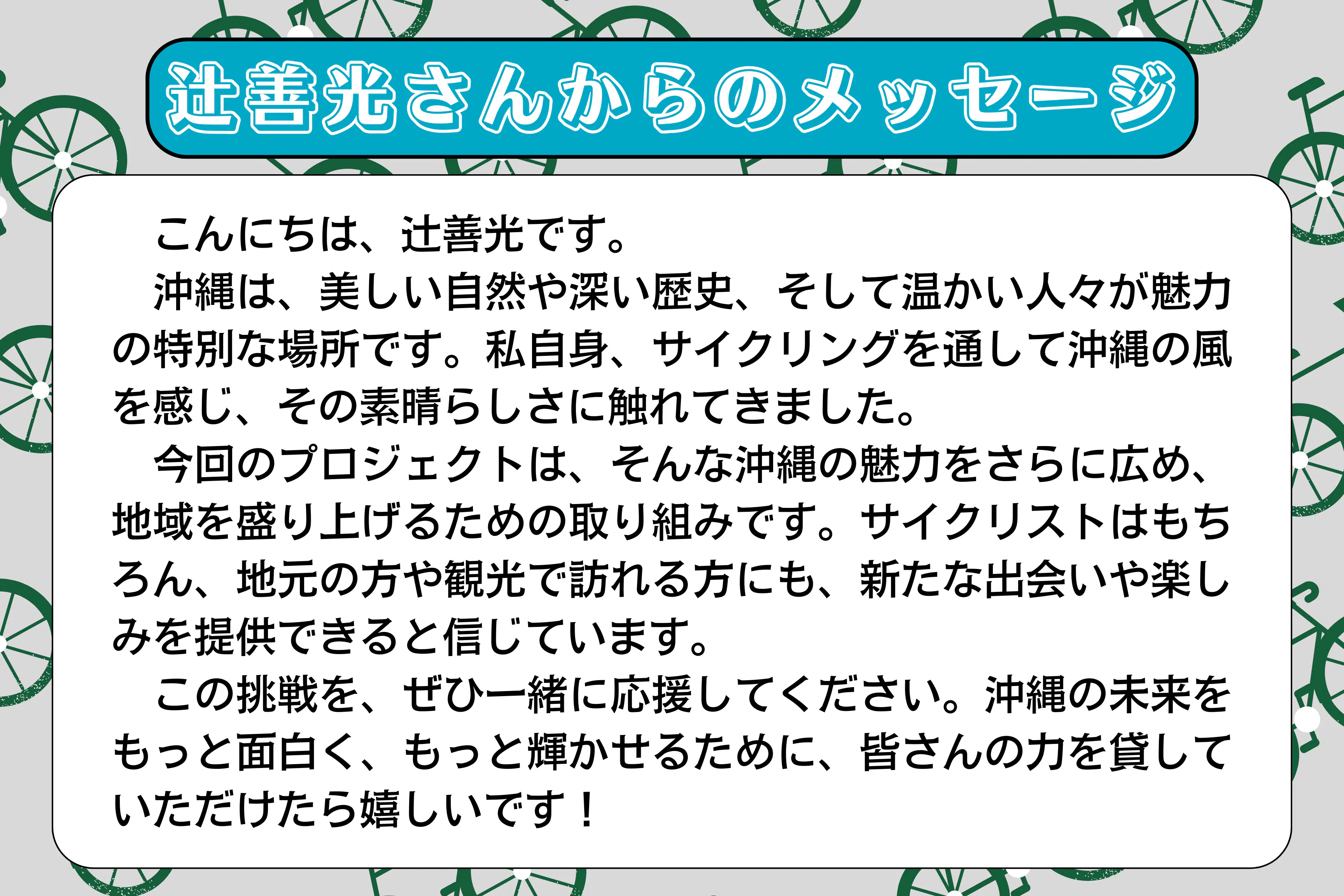 本プロジェクトでは、修理・カスタム、選手育成、ロードバイクコンサルティングを通じて、沖縄のサイクリング文化をより広める役割を担います。