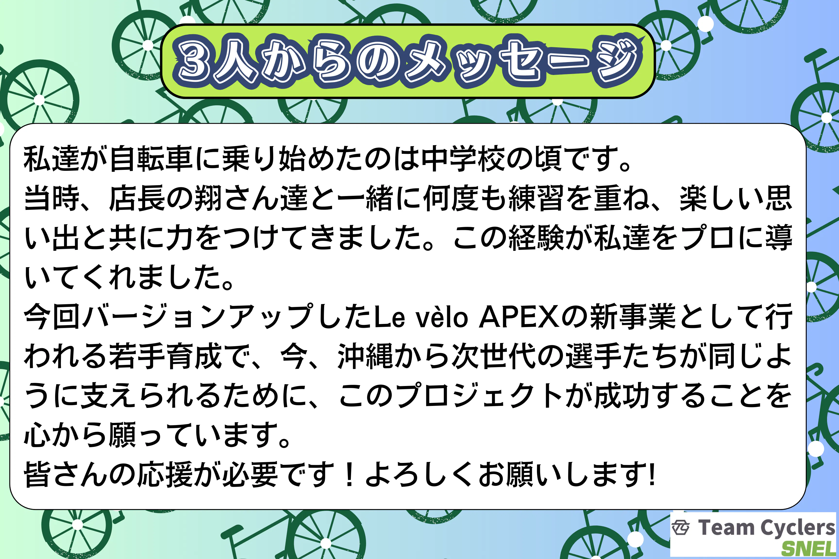また、修理やカスタムといった専門的なサービスを通じて、自転車愛好家に新たな発見と喜びを提供します。プロ選手を目指す若者たちにとっても、この場所が成長の舞台となることを願っています。