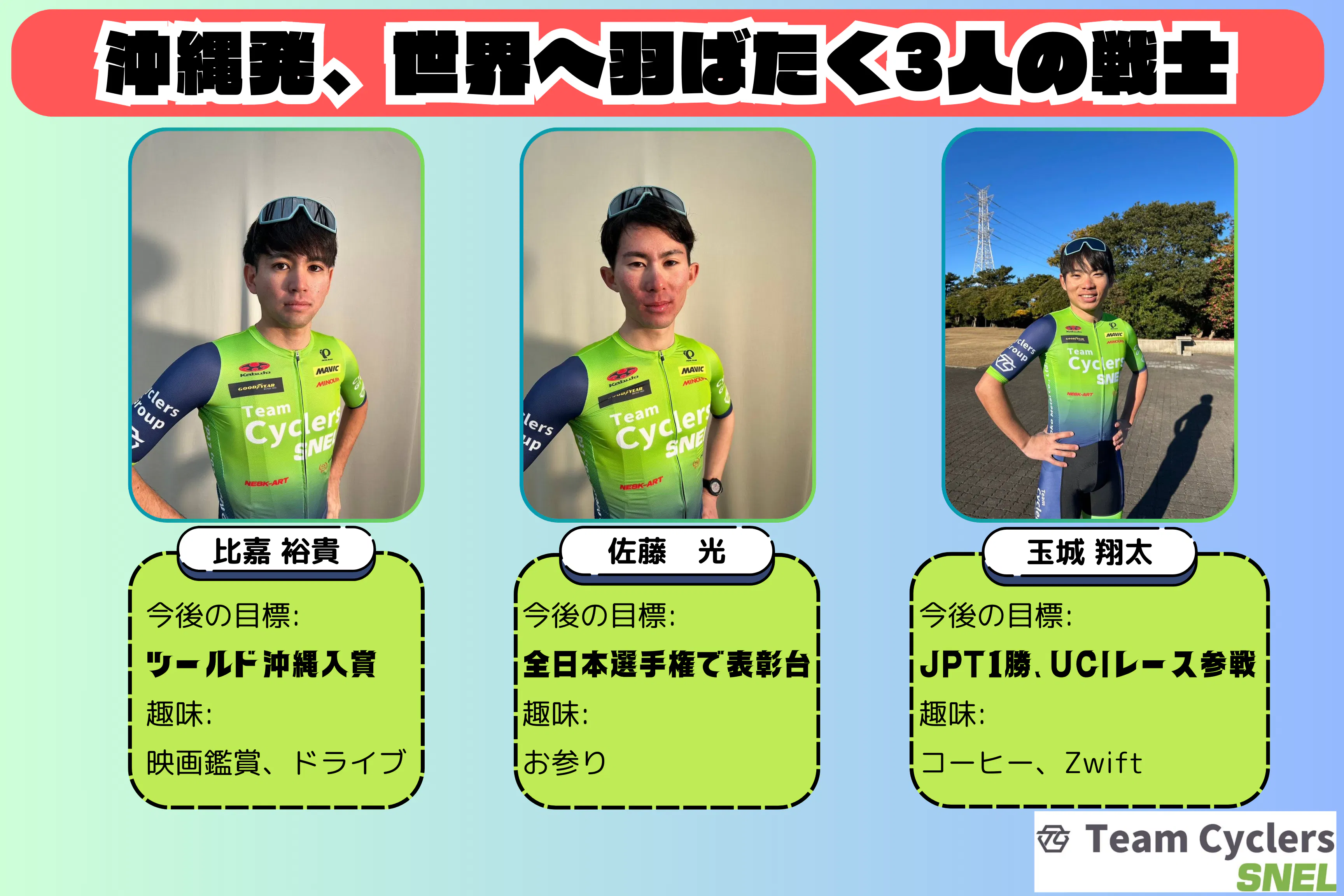 国内プロロードバイクチーム「Team Cyclers SNEL」に加入する沖縄県出身メンバー: 比嘉裕貴、佐藤光、玉城翔太