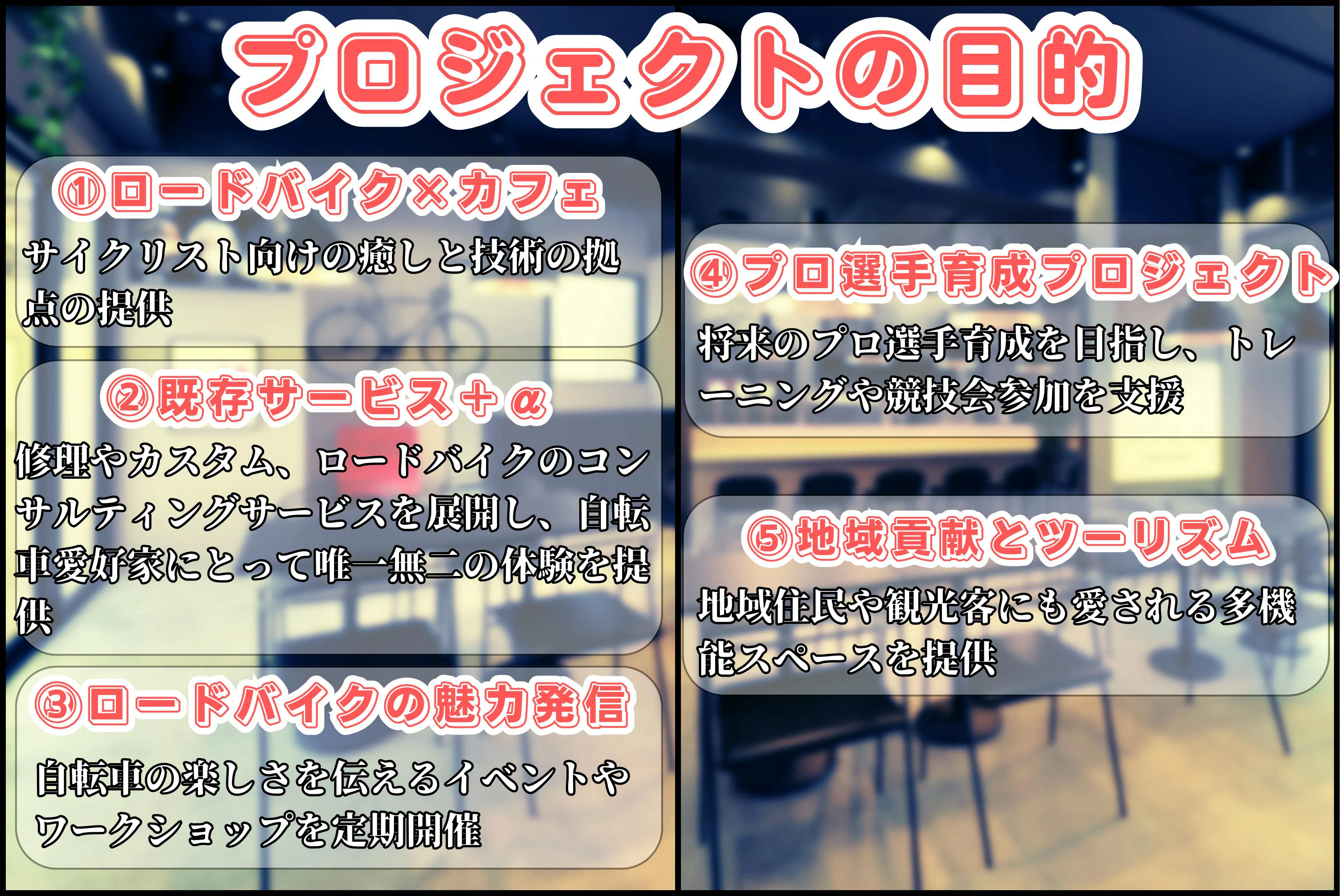 私たちは沖縄県那覇市に、新しいタイプのロードバイク専門店をオープンします。この店舗は、サイクリストにとって夢のような拠点を目指し、修理やカスタム、選手育成などのサービスを提供するとともに、初心者から競技選手まで幅広いニーズにお応えします。 - そして、カフェ&バーの要素を融合させることで、ライドの途中に立ち寄ってリフレッシュしたり、自転車仲間との交流を楽しんだりできるユニークな空間を実現します。