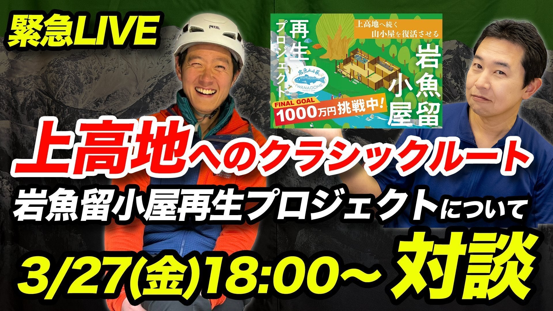 岩魚留小屋再生プロジェクトにご支援してくださった皆さま、活動を温かく見守ってくださっている皆さま、たまたまページを見てくださった皆さま、活動報告をご覧いただきありがとうございます!クラウドファンディング終了の3月29日(日)まで、残り日数がわずかとなってきました。そこで皆さまにお知らせが2点あります!・3月27日(金)18:00~『ヤマレコ社長の絶対遭難させないチャンネル』にて、生配信を行います!岩魚留小屋の紹介もしつつ、文字だけでは伝えきれない岩魚留小屋の魅力や個人的な想いなどたくさん話せたらと思っています。質問等にもお答えいたしますので、ぜひご覧ください!!チャンネル登録と通知を受け取る設定をお願いします・3月28日(土)景信山~高尾山でPR山行を行います!メンバーは塩湯と広報担当のみほさんです。当日は、小仏バス停からスタートし景信山、高尾山へ歩きます。景信山山頂(9:30~10:30予定)、城山(11:30~12:30予定)にて少し長めに滞在するのでぜひ声かけてください!道中でもぜひ声かけてください!ご支援を迷われている方、もっとプロジェクトについて知りたい方は、ぜひご参加ください!!