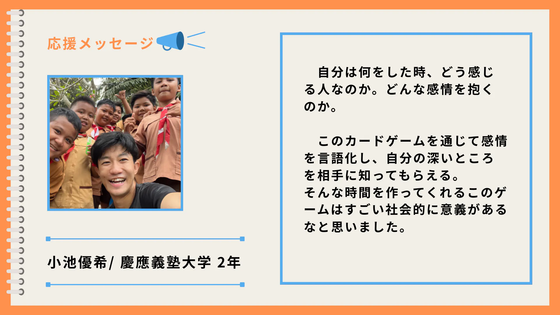 自分は何をした時、どう感じる人なのか。どんな感情を抱くのか。このカードゲームを通じて感情を言語化し、自分の深いところを相手に知ってもらえる。そんな時間を作ってくれるこのゲームはすごい社会的に意義があるなと思いました。