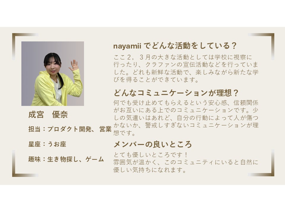成宮さんは、新しい挑戦にも前向きに取り組んでくださり、その姿勢がチームにとって大きな励みになっています。この数ヶ月の活動の大きな前進に繋がっています。また、成宮さんの声かけが、団体に和やかな雰囲気をもたらしてくれていて、安心して話せる雰囲気が生まれています。まっすぐな思いで活動に取り組む姿を尊敬しています。これからも、どうぞよろしくお願いいたします。