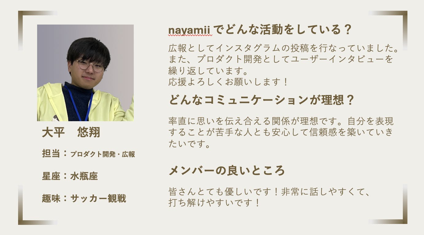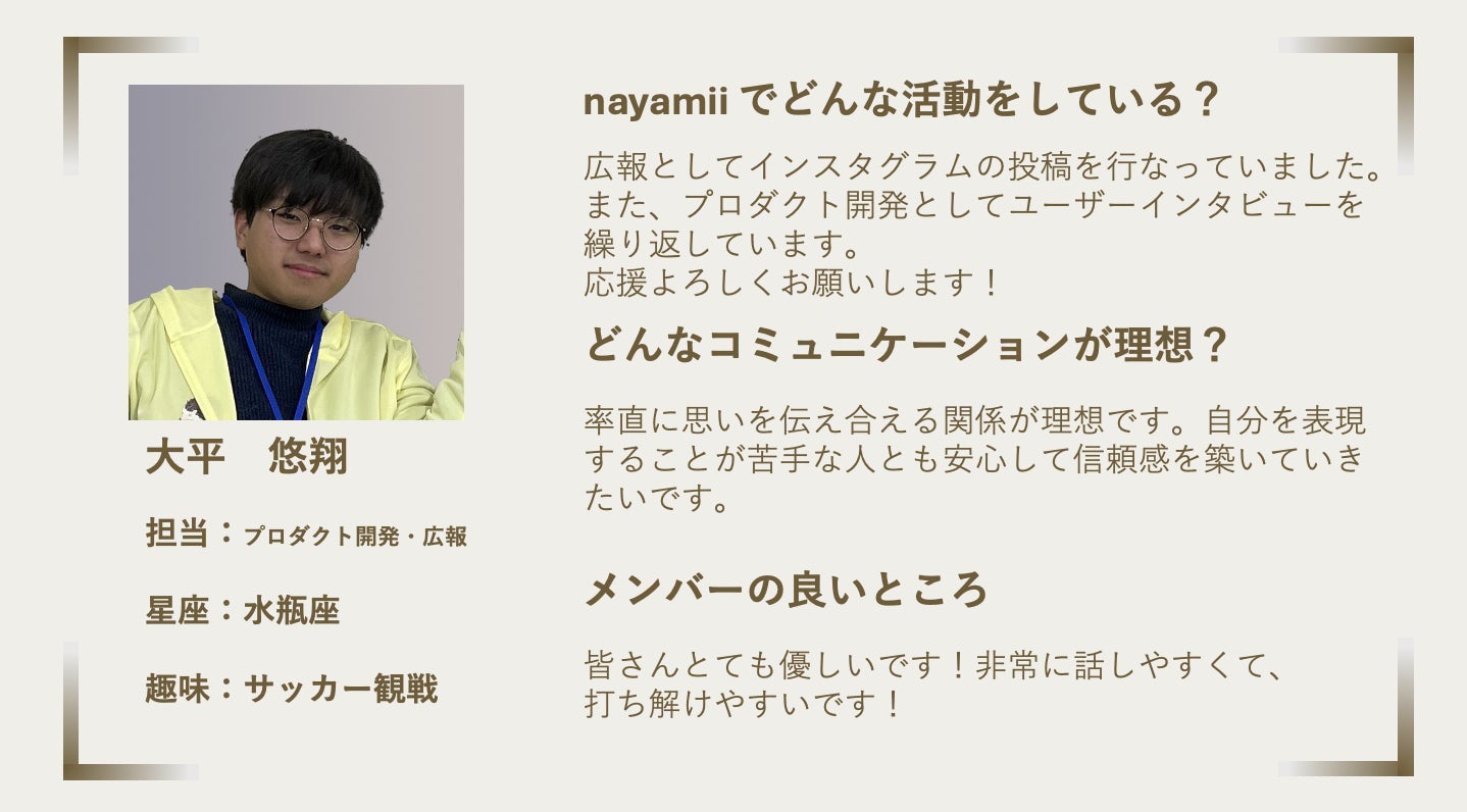 大平さんは、いつもストイックに物事に取り組んだり、学びの機会を貪欲に求めたりしていて、チーム全体に大きな刺激を与えてくれています。活動を盛り上げてくれている一人です。思ったことを率直に伝えてくれて、普段薄れがちなユーザーの視点を気づかせてくれます。これからもますます成長していく大平くんをとても頼もしく思っています!