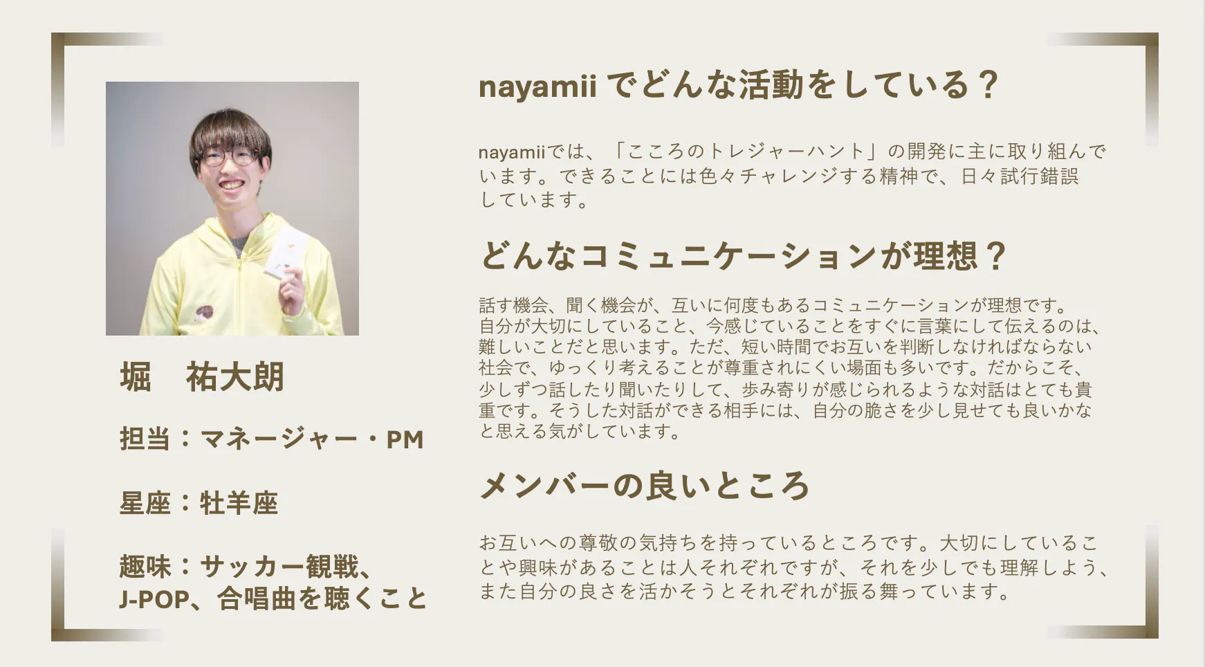 nayamiiでは、「こころのトレジャーハント」の開発に主に取り組んでいます。できることには色々チャレンジする精神で、日々試行錯誤しています。