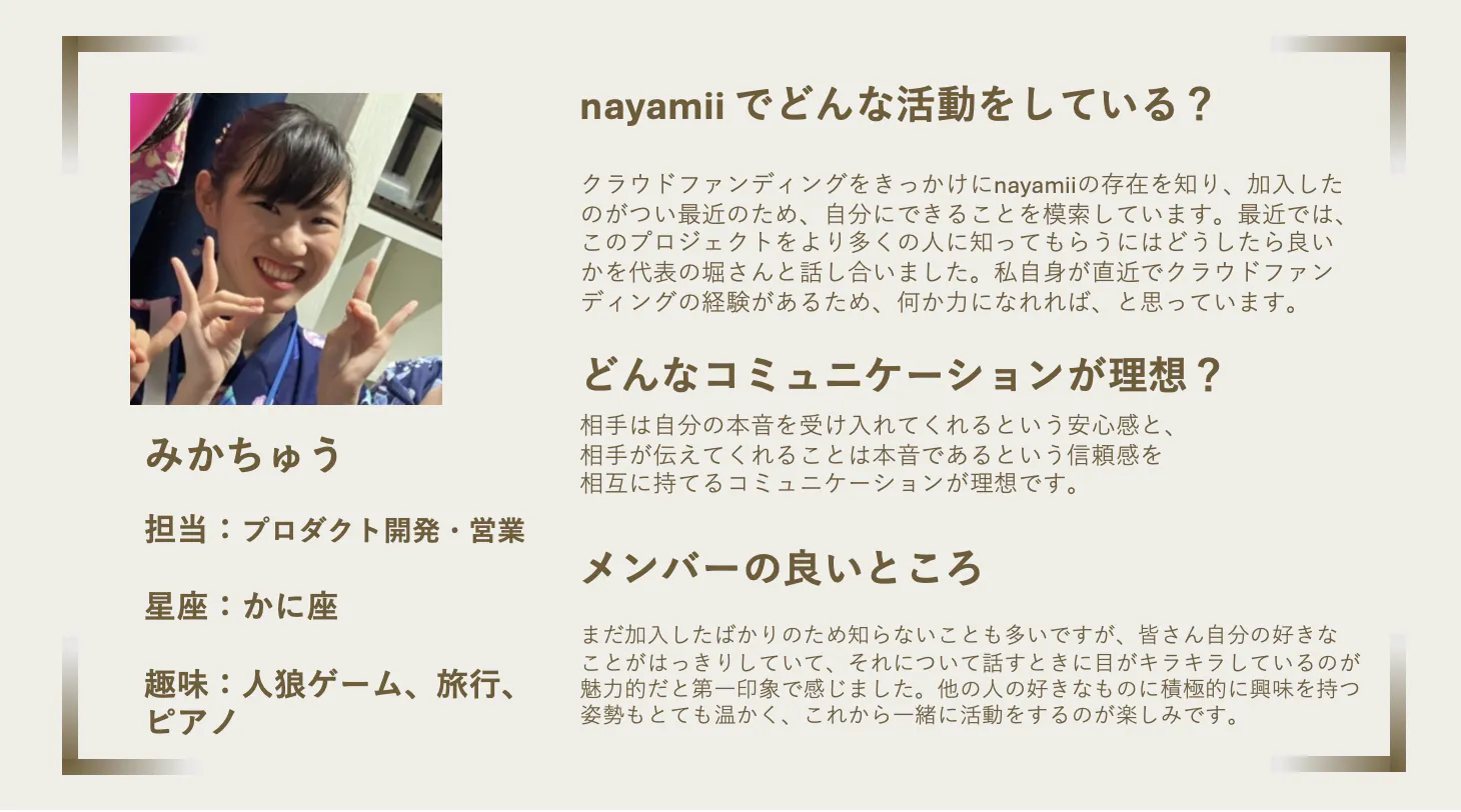 私は、このクラウドファンディングをきっかけにnayamiiを知り、支援者として以上にnayamiiに関わりたいと思い、加入を決めました。まだ加入して1か月も経っていませんが、それでも代表の堀さんをはじめ、nayamiiのメンバー皆さんがこのクラウドファンディングを成功させるためにものすごく頑張っている姿がひしひしと伝わってきます。新メンバーの私にも皆さんとても温かく接してくださり、nayamiiは本当に素晴らしいチームだと心の底から感じました。そんな皆さんが挑戦しているクラウドファンディングに、私も滑り込みではありますがメンバーの一員として関われることをとても誇りに思っています。