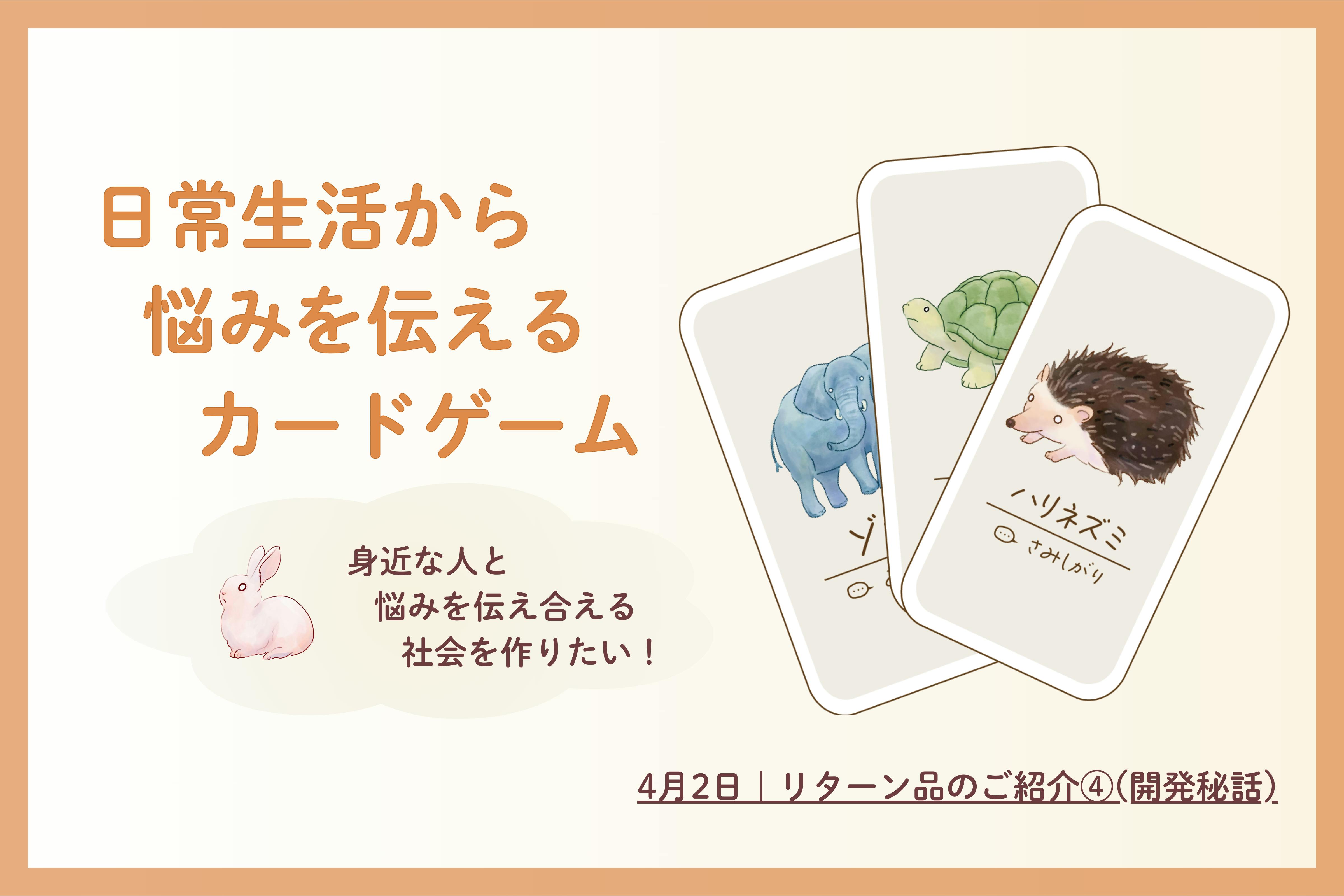こんばんは!nayamii代表の堀 祐大朗です。最近は、「充実した1日だった」と感じるためにどのような考え方をすると良いのか、思考を巡らせています。今回は、プロジェクトのリターン品である、開発秘話1・2・3について、おすすめポイントをご紹介します!開発秘話1(一話完結)nayamii設立から、カードゲーム作成開始までの歴史を振り返ります。おすすめポイント・nayamiiがどのように生まれたのか、団体設立のきっかけとなった想いや人との出会いを知ることができます。・プロダクトができるまでの、試行錯誤の中で得た気づきや、大切にしてきた想いを記載しています。・団体を立ち上げる背景にあるストーリーに興味がある方に特におすすめです。開発秘話2(一話完結)カードゲーム作成から、学校への導入直前までの歴史を振り返ります。おすすめポイント・悩みを絵にするという活動から、「こころのトレジャーハント」が完成するまでの道のりを詳しく知ることができます。・身近な人に相談できる社会を作るために、こだわって取り組んできた研究やデザインについて、ご紹介します。・ゲーム制作やアイデアを形にする過程に興味がある方におすすめです。開発秘話3(一話完結)悩みを話すことに関するコミュニケーションの未来について、nayamiiメンバーが語り合った内容が開発秘話になりました。おすすめポイント・団体の活動を通して作っていきたいコミュニケーションを、メンバーが真剣に語り合った内容を掲載しています。・メンバーそれぞれの多様な価値観や、日常のエピソードを通して、団体の雰囲気やメンバーの様子も感じ取れます。・コミュニケーションの未来や、これからの活動展開に興味がある方におすすめです。どのリターンも、nayamiiの活動をより詳しく知っていただける内容になっています。ぜひご一読ください!(堀 祐大朗)