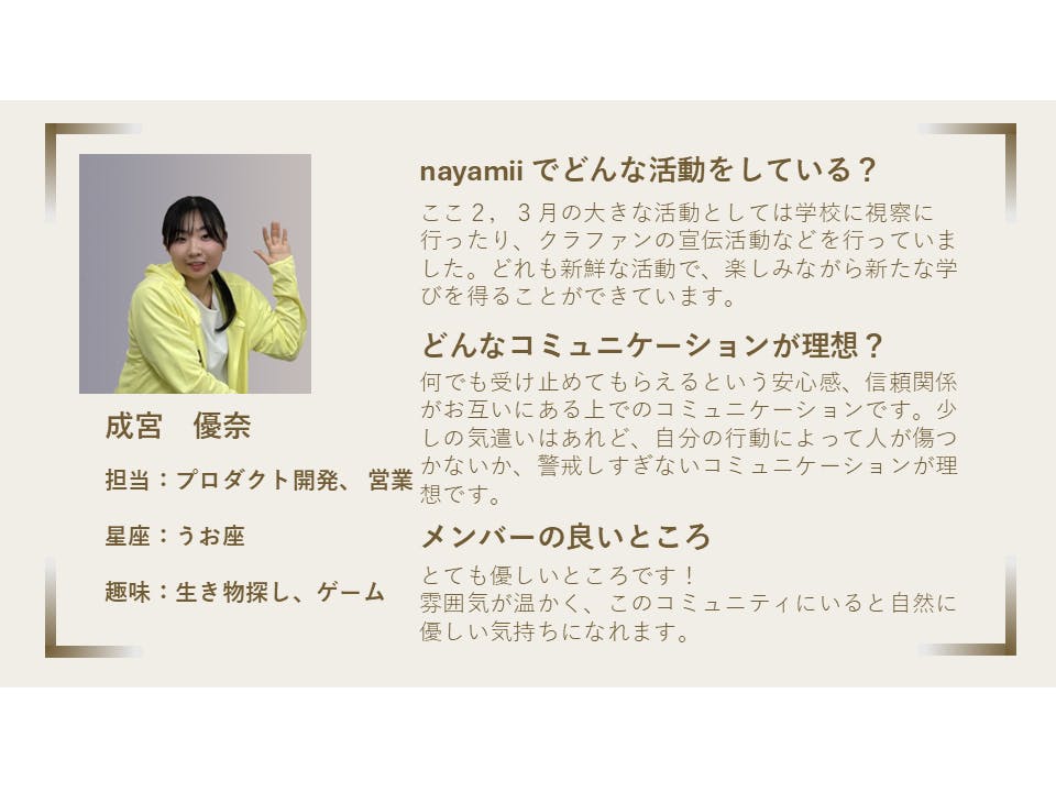 こんにちは!3月も終わりに近づいてきました。今年の1/4が過ぎたと思うと感慨深いですね...。今回の活動報告では、私たちの団体で共に活動しているメンバー、成宮さんをご紹介します。ー nayamii ではどんな活動をしている?nayamii では、プロダクト開発と営業チームで活動しています!ここ2,3月の大きな活動としては学校に視察に行ったり、クラファンの宣伝活動などを行っていました。どれも新鮮な活動で、楽しみながら新たな学びを得ることができています。ー どんなコミュニケーションが理想?何でも受け止めてもらえるという安心感、信頼関係がお互いにある上でのコミュニケーションです。少しの気遣いはあれど、自分の行動によって人が傷つかないか、警戒しすぎないコミュニケーションが理想です。ー メンバーの良いところとても優しいところです!温かい雰囲気で、このコミュニティにいると自然に優しい気持ちになれます。ー代表・堀からのコメント成宮さんは、新しい挑戦にも前向きに取り組んでくださり、その姿勢がチームにとって大きな励みになっています。この数ヶ月の活動の大きな前進に繋がっています。また、成宮さんの声かけが、団体に和やかな雰囲気をもたらしてくれていて、安心して話せる雰囲気が生まれています。まっすぐな思いで活動に取り組む姿を尊敬しています。これからも、どうぞよろしくお願いいたします。引き続き、プロジェクトの進展をお伝えします。活動報告お楽しみにお待ちください!(成宮優奈・堀祐大朗)