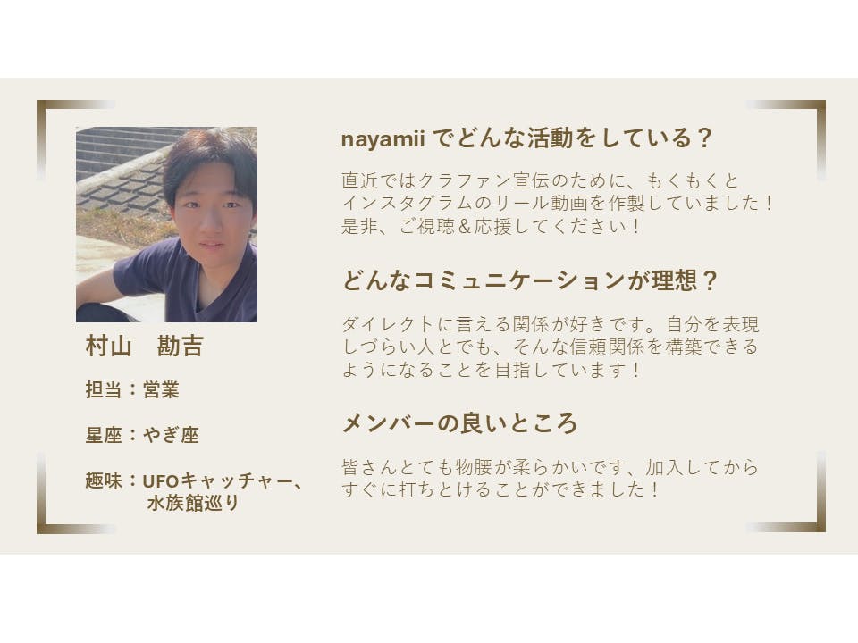 クラウドファンディング開始後、多くの温かい応援とご支援をいただき、誠にありがとうございます。今回の活動報告では、私たちの団体で活動を共にしているメンバーの村山さんを紹介します。ー nayamii ではどんな活動をしている?nayamii では、営業チームの一員として活動しています!本プロジェクトを、より多くの皆さまに知っていただくためインスタグラムのリール動画を公開しているのですが、主にその動画の作成を行っています!リール動画では、nayamii が設立してからの歩みを掲載しています!是非ご覧ください!ー どんなコミュニケーションが理想?自分の意見を素直に言いあえる関係がとても素敵だなと思います。特に、自身の悩みや不安など本当に困っていることを相手に伝えるとき、そんな関係の人が身近にいたら解決の一歩になるのではないかと考えています!ー メンバーの良い所自身の悩み事を相談すると、丁寧すぎるほどに話を聞いてくれて、とても共感してくれます!またメンバー全員とても優しく、活動ミーティングでもお互いの意見を最大限に尊重しているのが良い所だと感じてます!ー 代表・堀からのコメント村山さんは、いつも温かい声かけや魅力的なイベント企画をしてくださいます。その結果、メンバーの活動が活発になっています。また、プロジェクトを進めていると、どうしても自分たちの思いが先行してしまい、アイデア中心の議論になりがちです。使ってくださる方の抱える課題に丁寧に耳を傾けたり、マーケティングの視点を取り入れることが少なくなってしまいます。そのような中で、村山さんがアイデアとマーケティングの両方の視点をバランスよく取り入れた提案をしてくださり、プロジェクトが着実に前進しています。いつもありがとうございます!今後ともよろしくお願いします。今後も、団体の活動や思いを随時お伝えしますので、引き続き応援のほどよろしくお願いします!(村山勘吉・堀祐大朗)