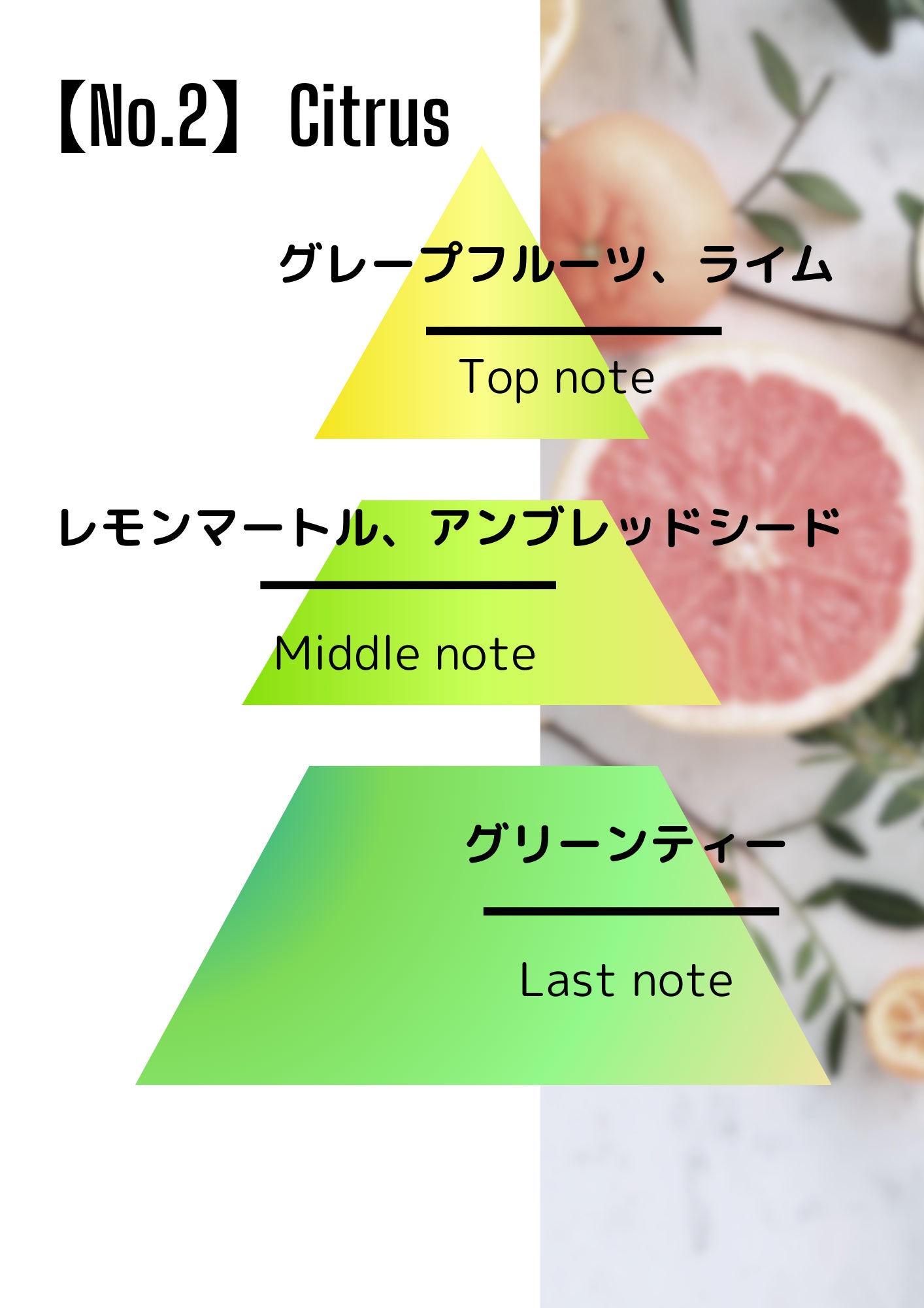 Topは、爽やかな柑橘系がハッキリと香るように、濃度高く調合しました。 そのあとに重なるように入ってくるレモンそのものの香りのようですが、よりどっしりと存在感を放ち伸びていくレモンマートルを調合。また、アンブレッドシードという植物系のムスクも調合。 最後に重なるかなり希少なグリーンティーから抽出したアロマをLastに定着してきます。 爽やかな柑橘系のフレグランスですが、このグリーンティーとアンブレッドシードにより、分かりやすすぎない、オシャレな香りへ仕上げました。